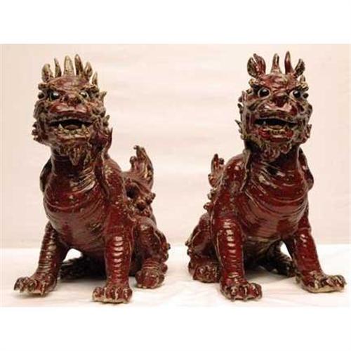 A really interesting pair of red ceramic Chinese Fu Dogs. Their fur is standing on end and their eyes are bulging. Fu Dogs (or lions) are powerful mythic protectors that have traditionally stood in front of Chinese imperial palaces, emperors' tombs and government offices. This pair is sure to bring conversation if not protection. 15"T, 13"D, 8"W, 14 lbs each. The spur on one of the feet is missing.