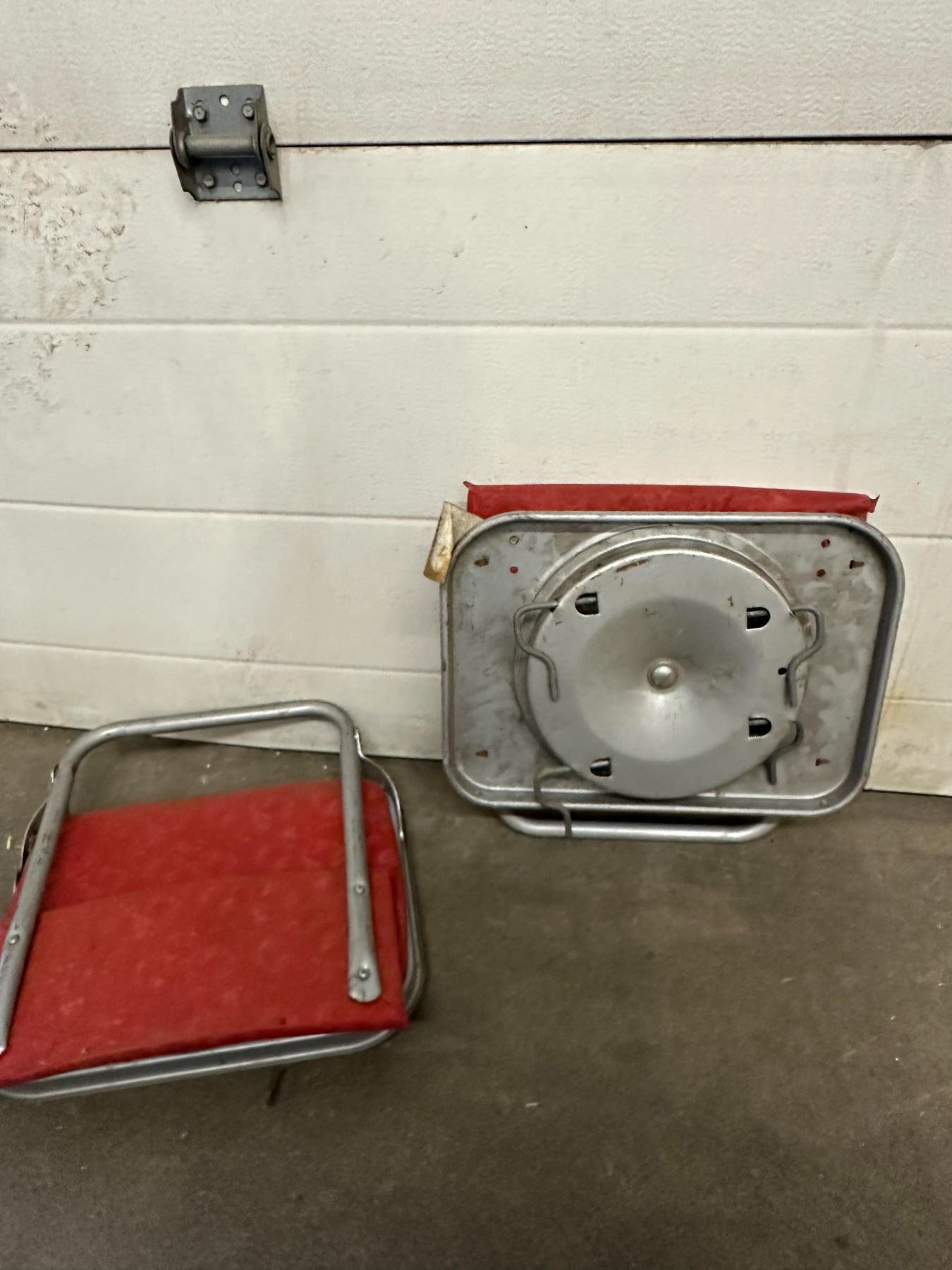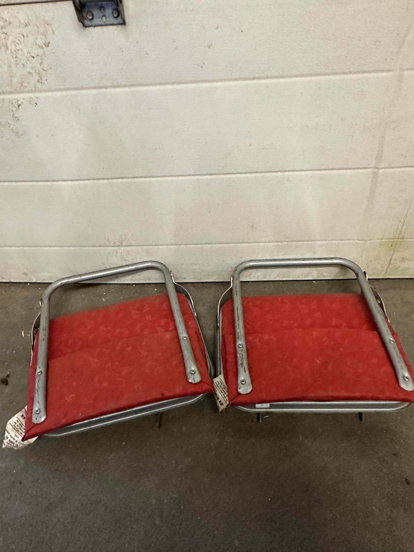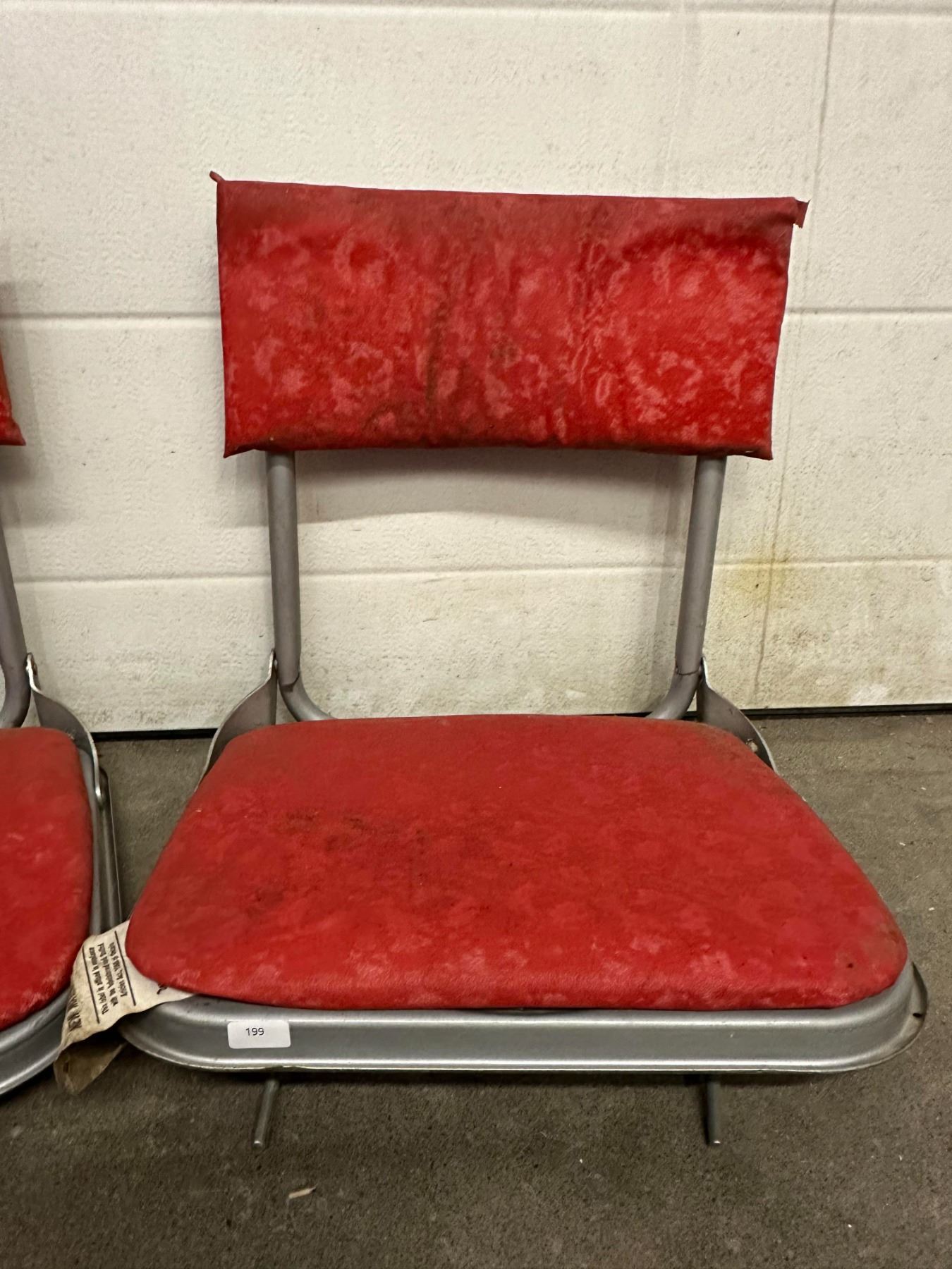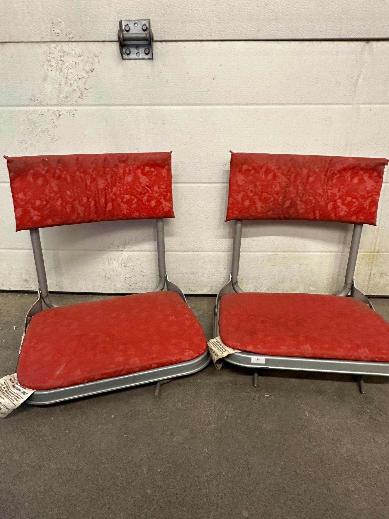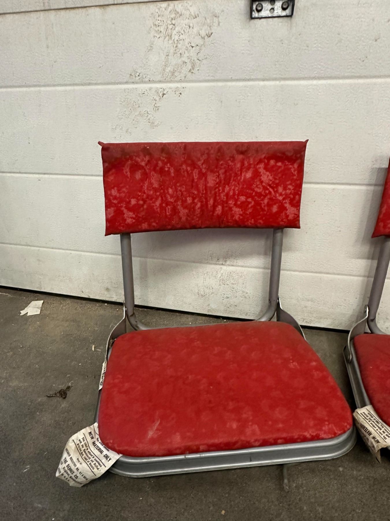 Two vintage red stadium-style fold-down seats; wear and marks from age.
