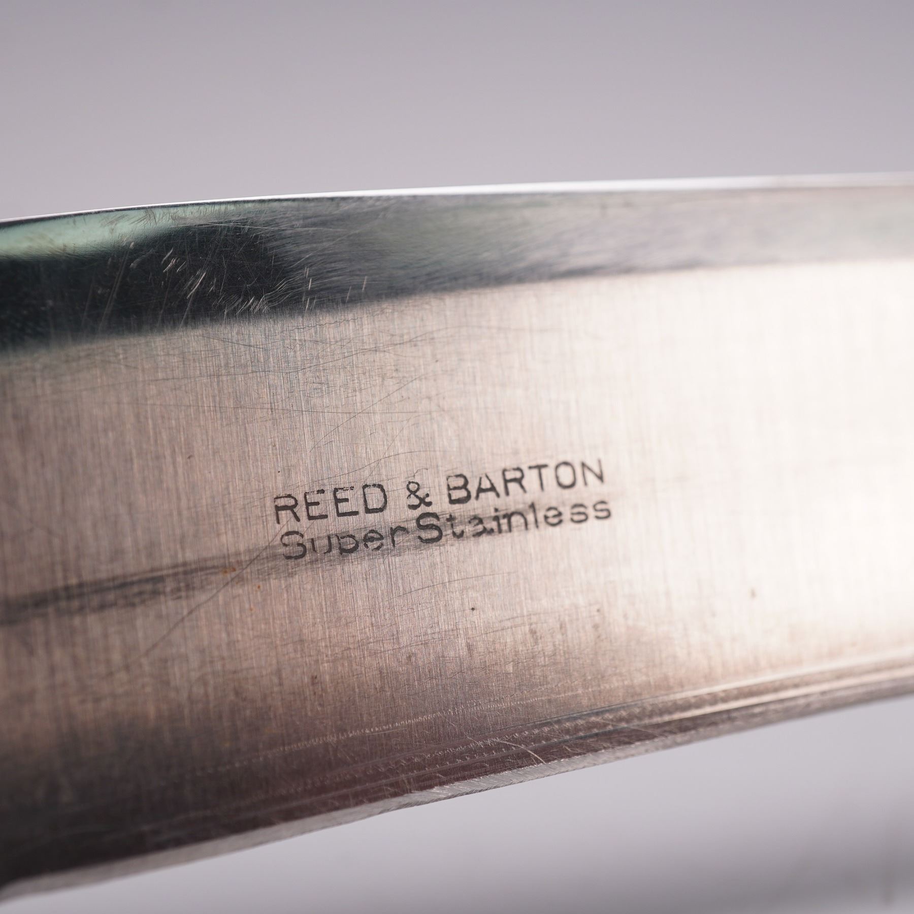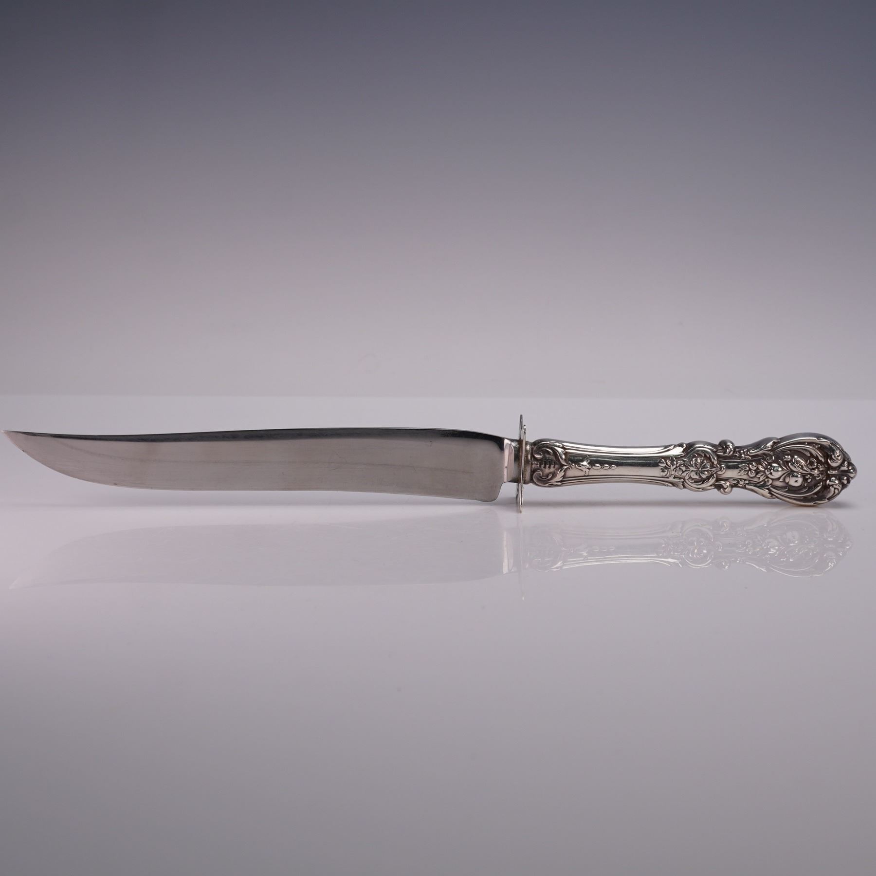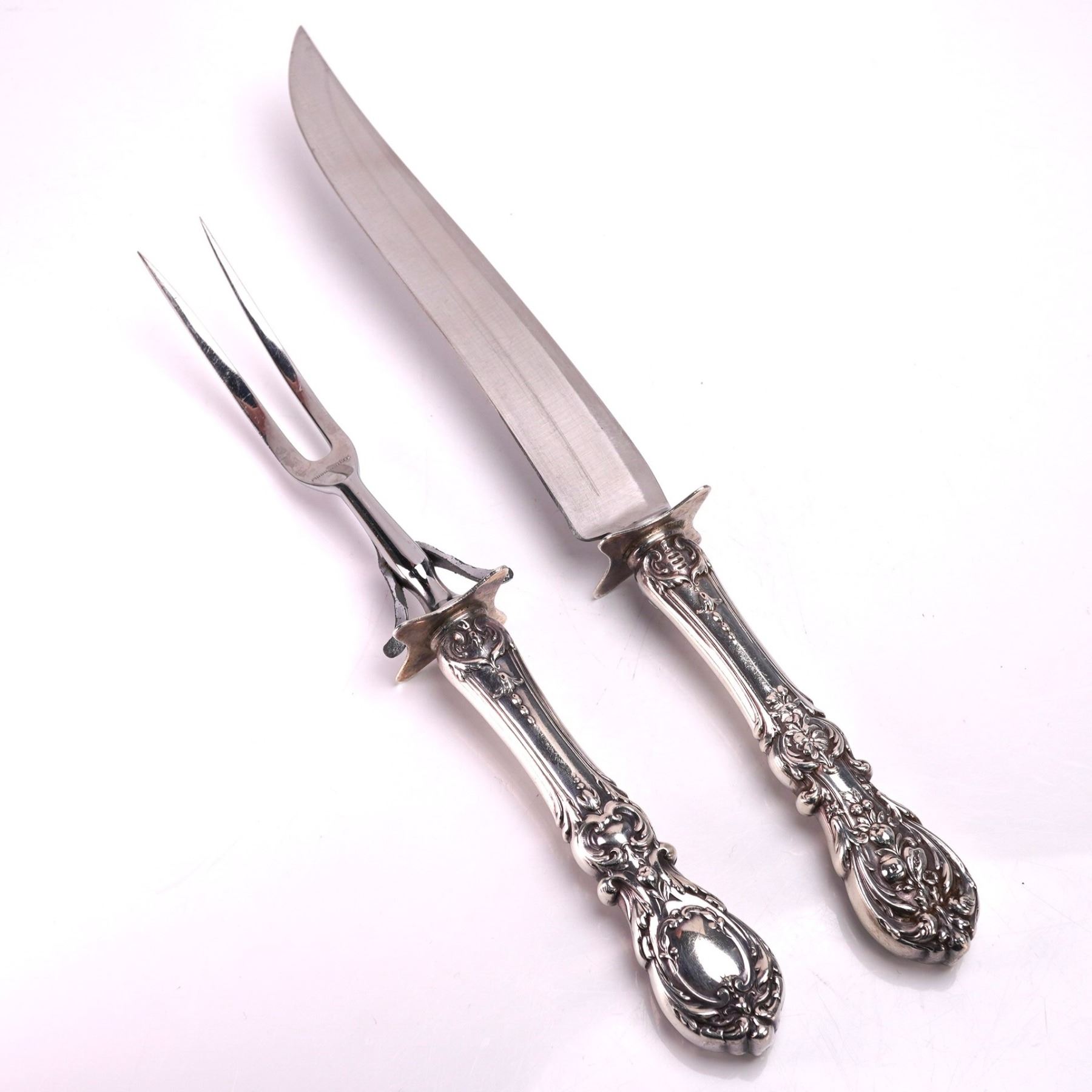Pair of stainless steel steak carving utensils by Reed & Barton in the Francis I pattern. The set includes: Carving Fork: Two-toned design with ornate Francis I handle. Marked Mirror-steel. Carving Knife: Curved blade with matching handle. Marked Reed & Barton Super Stainless. Both pieces feature the detailed scroll and fruit motifs characteristic of the Francis I pattern. The overall weight is 11oz. Carving fork: 1"L x 0.25"W x 11.25. Carving knife: 1.25"L x 0.25"W x 13.75"H.