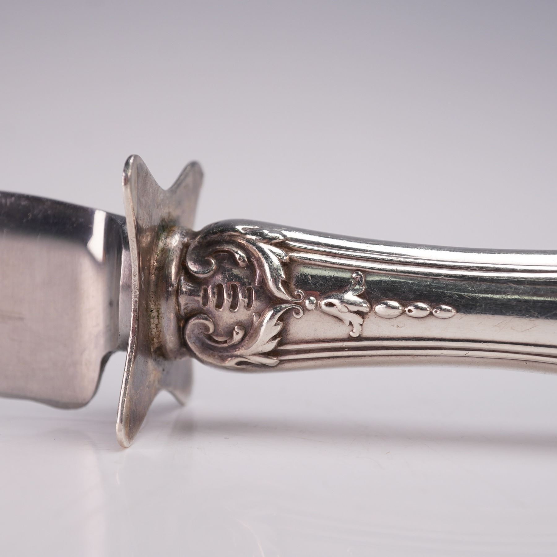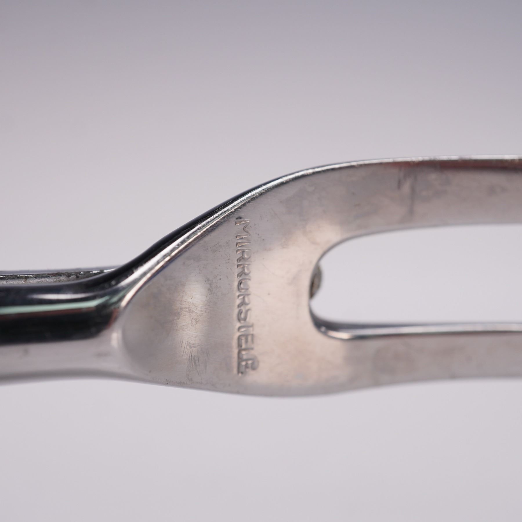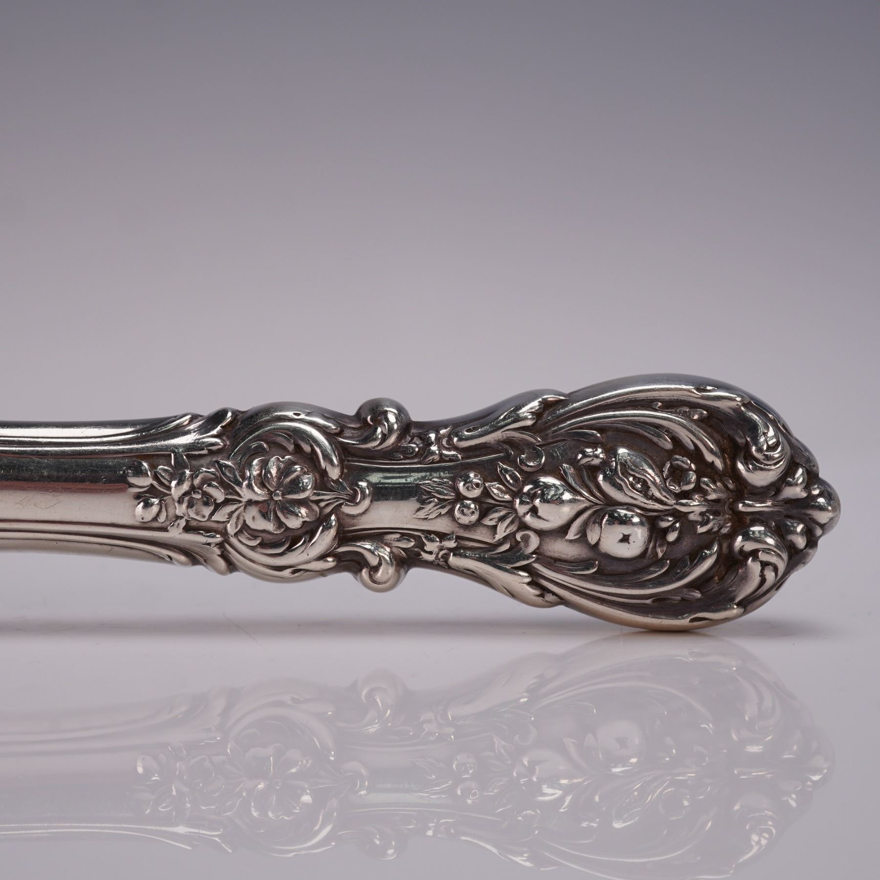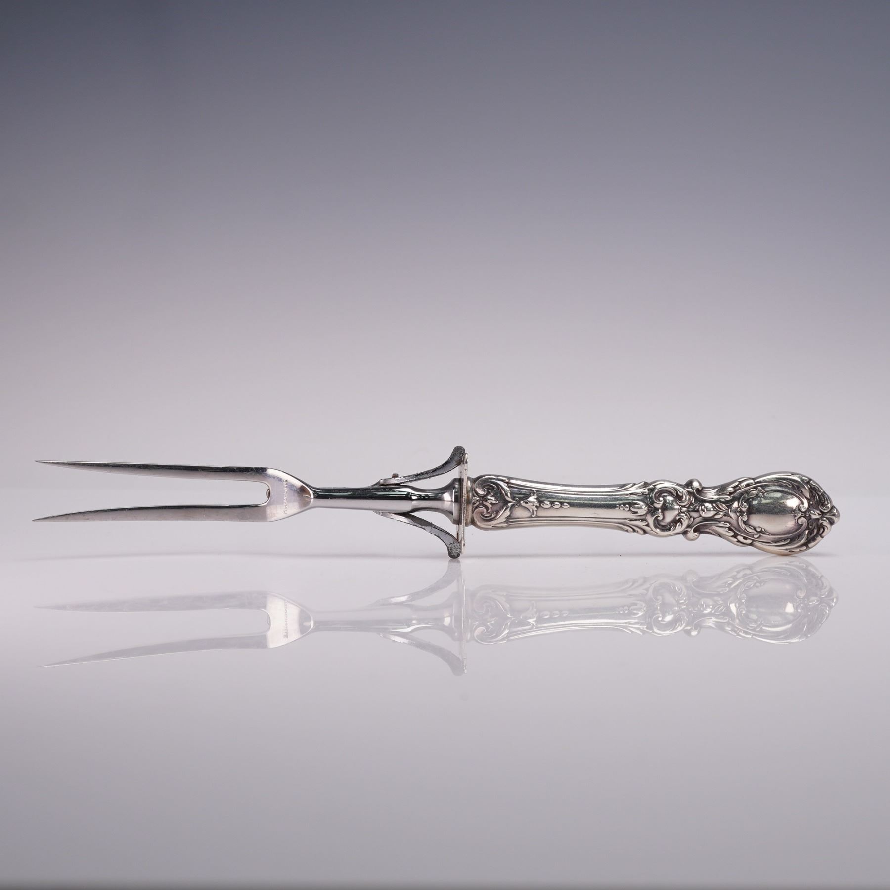 Pair of stainless steel steak carving utensils by Reed & Barton in the Francis I pattern. The set includes: Carving Fork: Two-toned design with ornate Francis I handle. Marked Mirror-steel. Carving Knife: Curved blade with matching handle. Marked Reed & Barton Super Stainless. Both pieces feature the detailed scroll and fruit motifs characteristic of the Francis I pattern. The overall weight is 11oz. Carving fork: 1"L x 0.25"W x 11.25. Carving knife: 1.25"L x 0.25"W x 13.75"H.