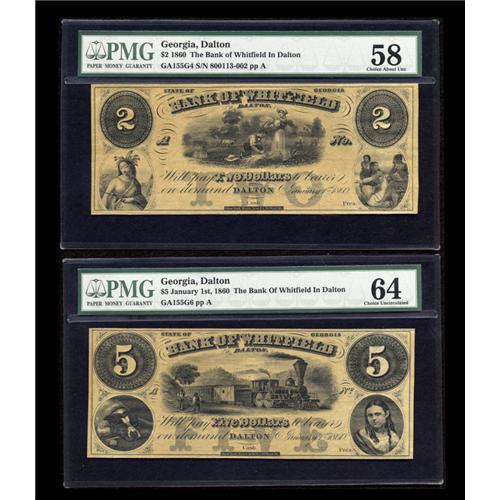 <B>Dalton, GA Pair of Remainders from the Bank of Whitfield</B></I><BR>$2 W222 <B>PMG Choice About Unc 58</B></I>,<BR>$5 W231 <B>PMG Choice Uncirculated 64.</B></I> The $5 example in this lot is seldom encountered at this lofty grade level.