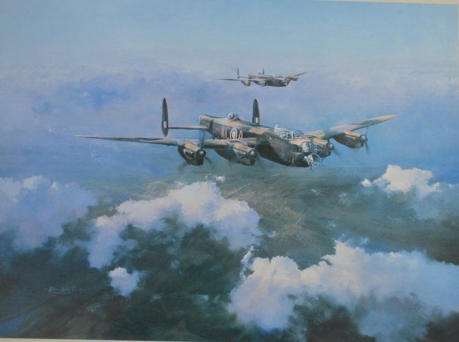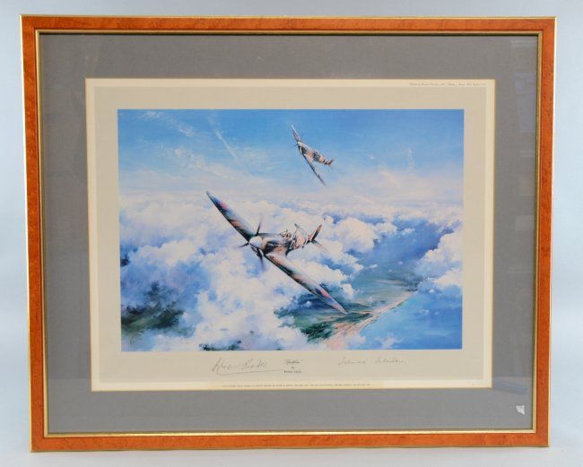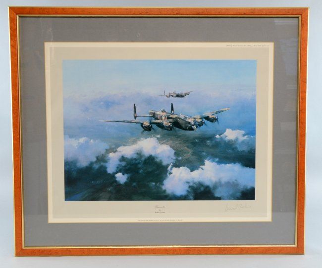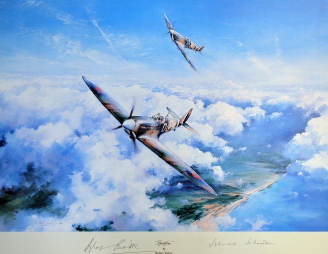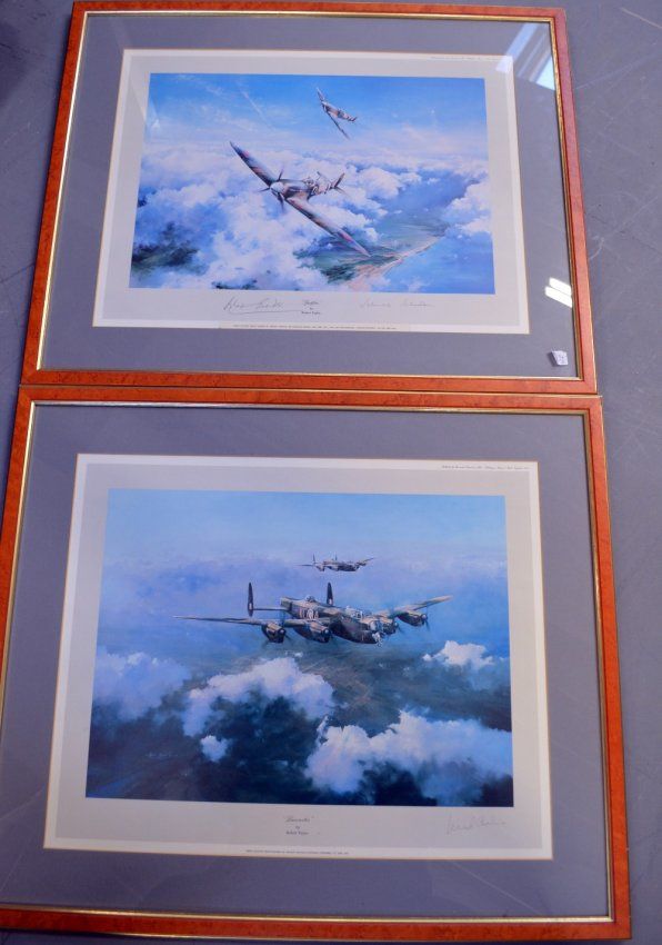 Pair of Robert Taylor signed prints of aircraft, signed by Douglas Bader and Johnny Johnson and Wellington bomber Captain Leonard Cheshire, each 17" x 22"