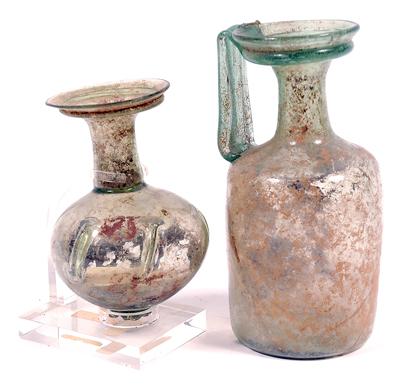 Pair of Roman Cylindrical Glass Bottles, circa 3rd-4th century A.D. Consists of: Large dark green single handle glass bottle on pale green body. Height 6¾" together with: Flared colorless glass jar with raised decoration. Height 5". On a custom display stand. Both pieces intact and in superb condition. Lot of 2 items.