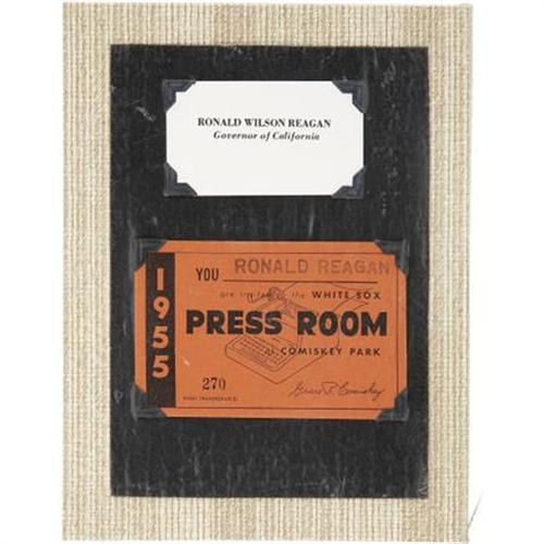<B>Pair of Ronald Reagan Related Items.</B></I> The lot includes an example of Reagan's calling card from his stint as Governor of California. The card measures 3" x 1.75". Also included is a 1955 Press Room pass for a White Sox game at Comiskey Park. The card measures 4.25" x 3.75" with Reagan's name stamped in ink at the top right corner. Both items have been mounted to a stiff backing utilizing paper corner brackets. Fine.<BR><BR><BR><b>Shipping:</b> Books & Catalogs (<a target="_blank" href="http://www.heritageauctions.com/common/shipping.php">view shipping information</a>)