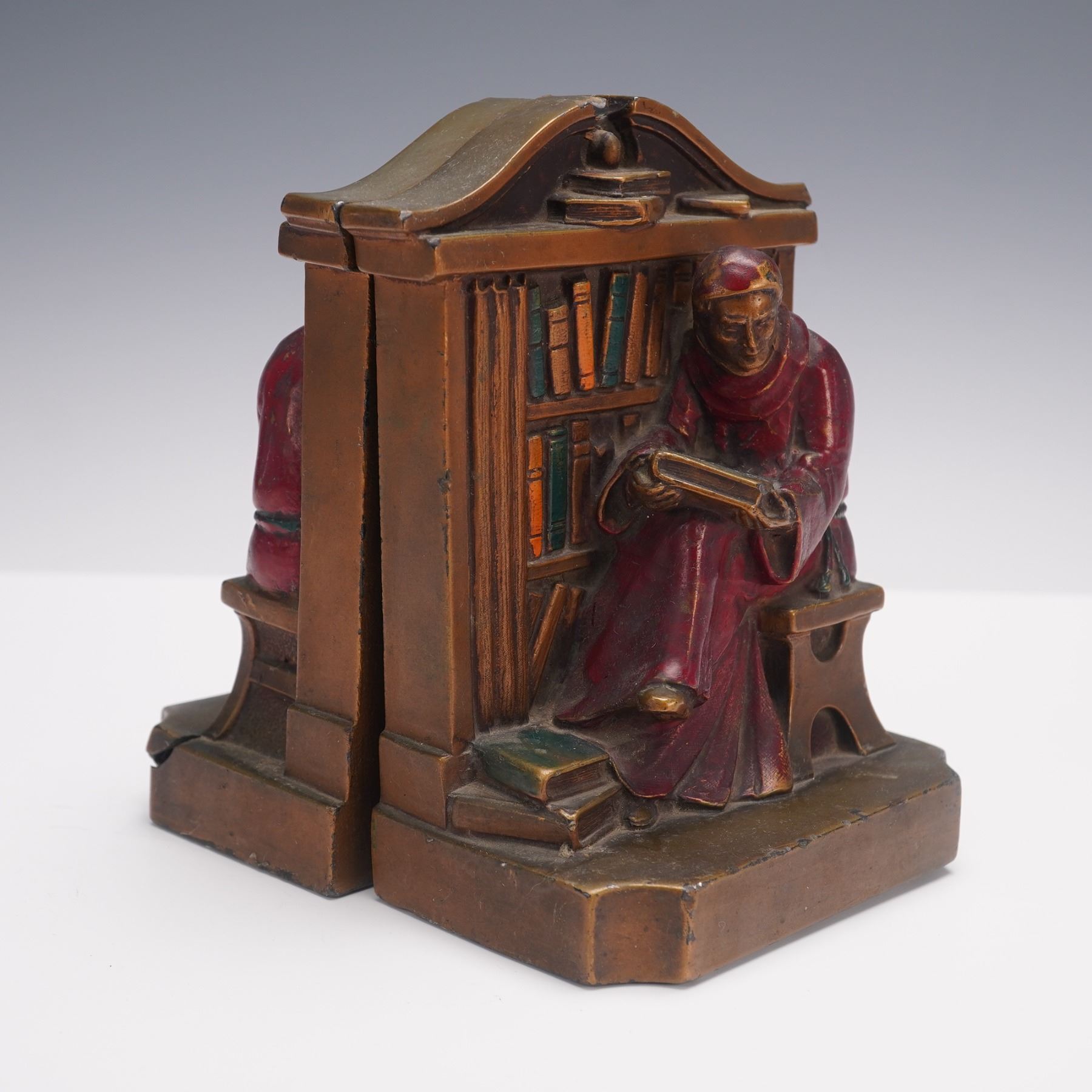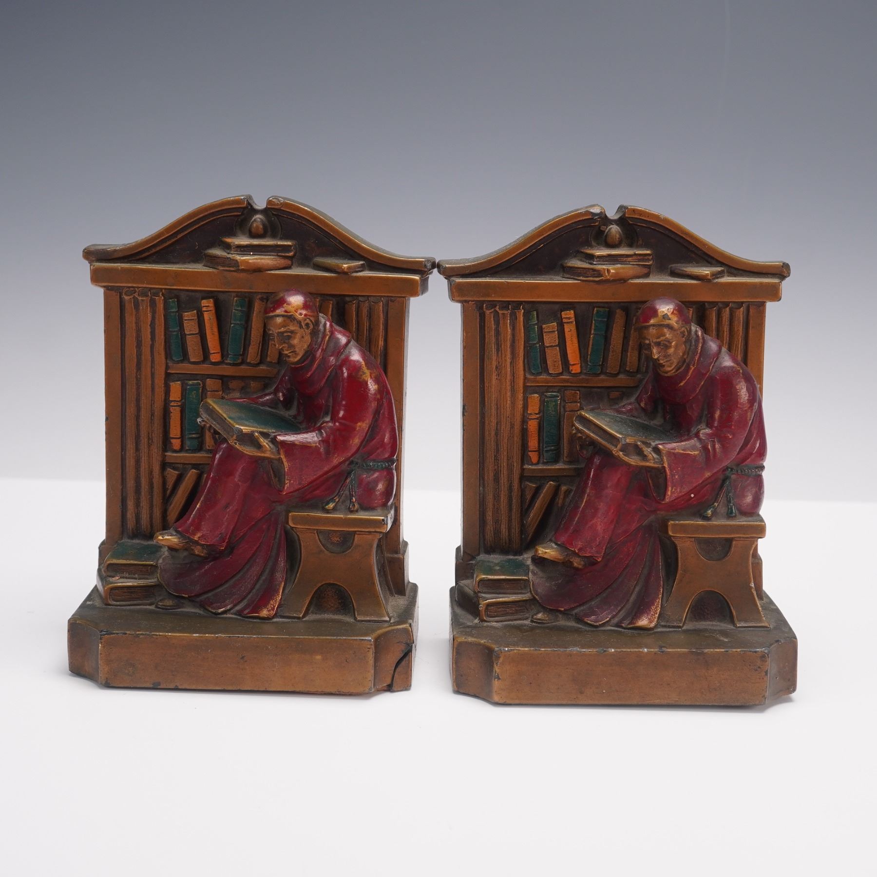 Each piece shows the robed figure in deep concentration, holding an open book with additional books at his feet, the scene framed by an arched library backdrop. Richly detailed with polychrome accents highlighting the monk's robe and the spines of the books, these bookends combine functionality with artistic craftsmanship, reflecting early 20th-century decorative design.