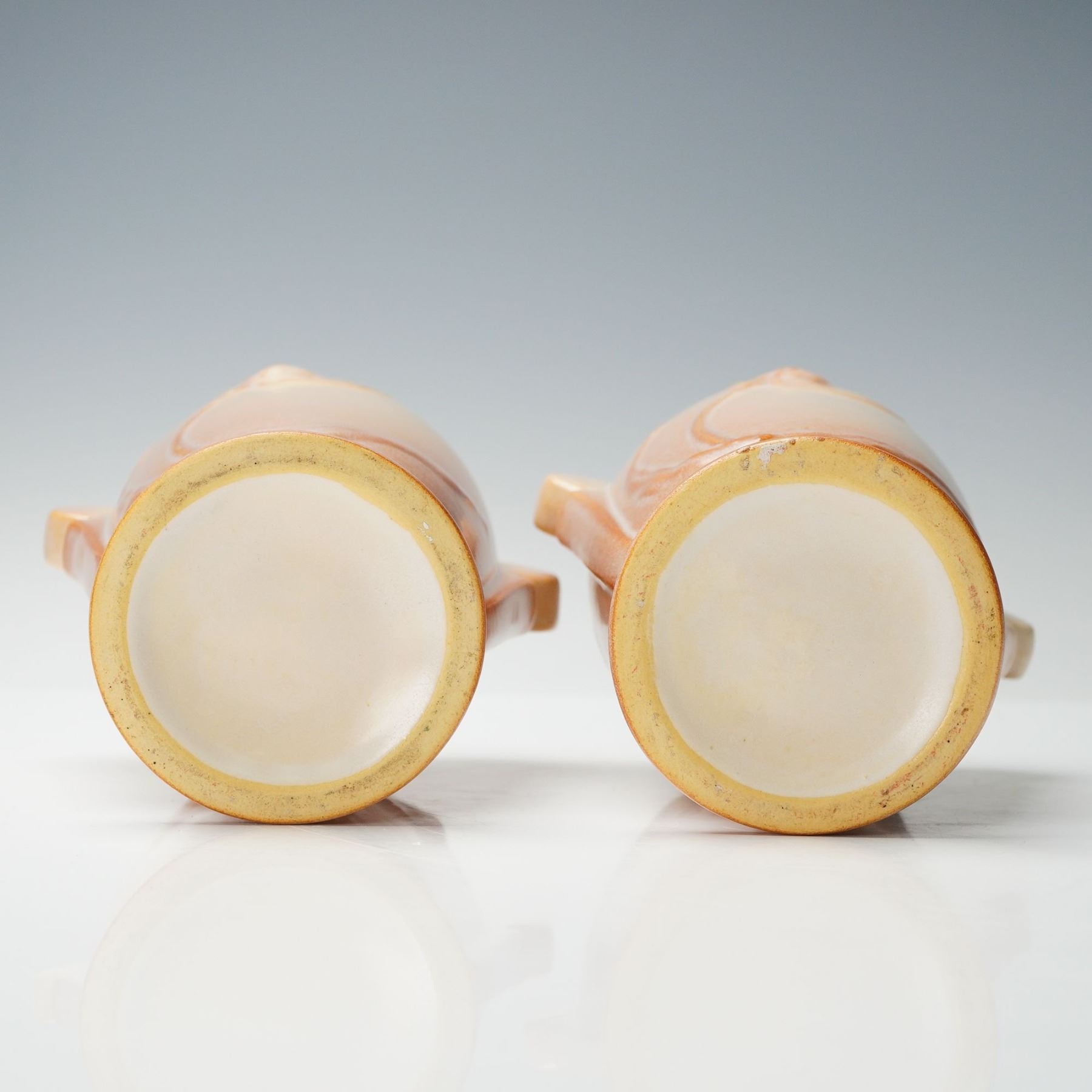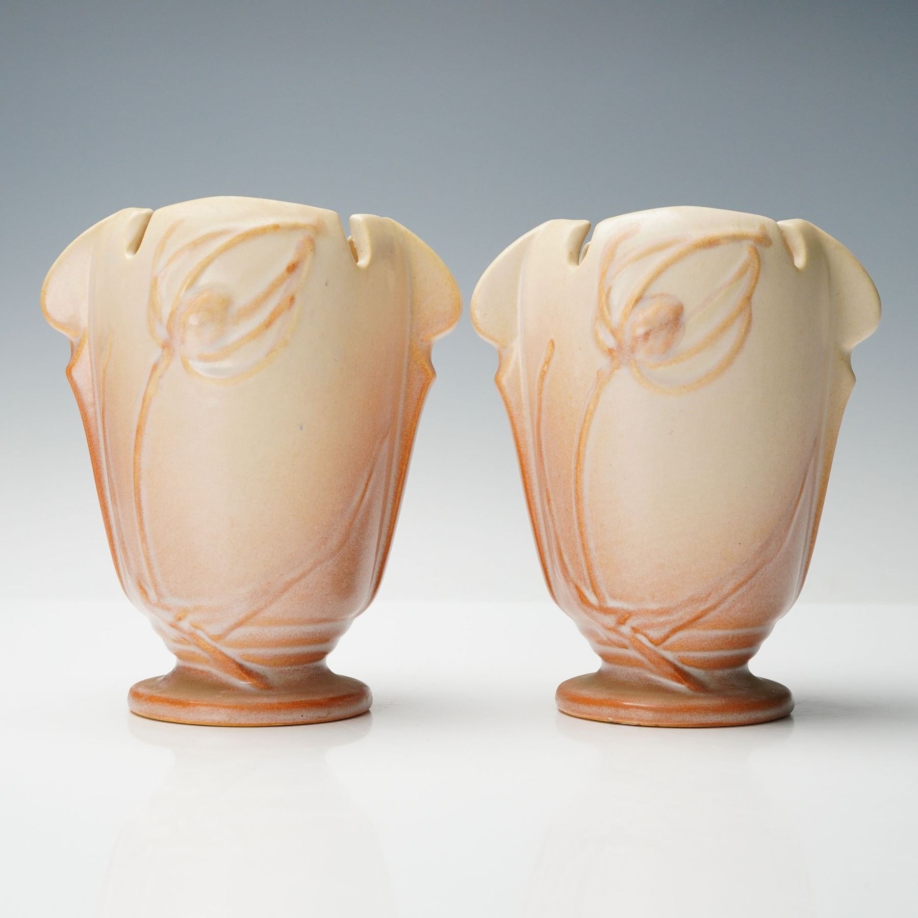 Beautiful matched pair of Roseville Pottery vases in the Teasel pattern, finished in a soft ivory-to-peach matte glaze with raised stylized floral relief. Each vase displays elegant Art Deco form with gently flared rim and symmetrical leaf handles. The design, introduced circa 1938, reflects Roseville's refined blend of sculptural craftsmanship and subtle coloration.