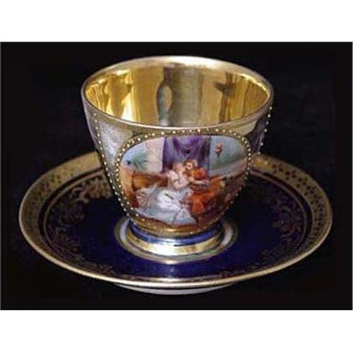 <table width="100%" border="0" cellspacing="0" cellpadding="4"><tr><td><em> Rare!</em></td></tr><tr> <td width="100%"> Royal Vienna cobalt blue and gold demitasse cup and saucer set. Each piece is richly decorated with gilt and a center medallion depicting a hand-painted classical scene. Each cup and saucer is marked with the blue, hand-painted beehive mark under the glaze characteristic of authentic Royal Vienna porcelain. There are two sets available (four pieces in total). The price listed is for the two pairs. In good used condition with small signs of wear, as shown. Matching coffee and sugar pot are available under separate listings. Please ask questions, request photos and shipping costs before buying.