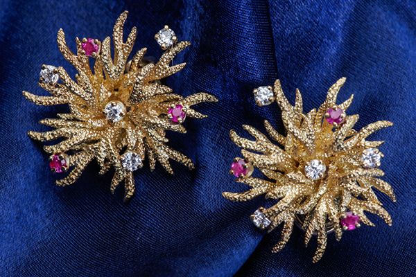 Pair of Ruby, Diamond, 18k Yellow Gold Earrings. The floral design earring are decorated by round diamonds and rubies, completed by clip backs, gross weight 15.60 grams.