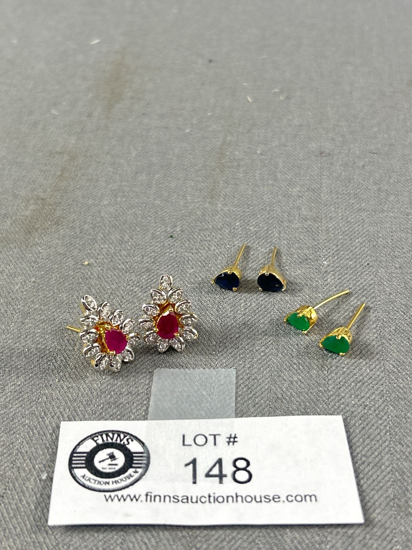 Pair of Ruby Red Stones Stud Earrings. Interchanged with Emerald Green & Sapphire Blue Stones Earrings. All in Beautiful Condition