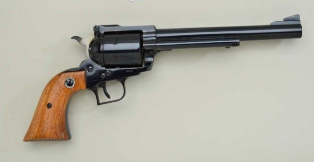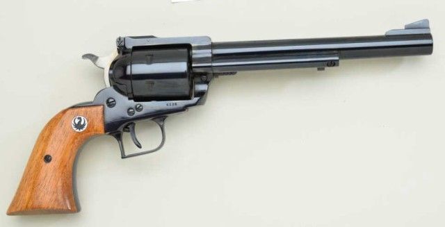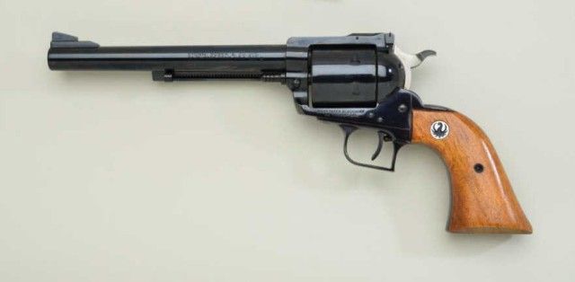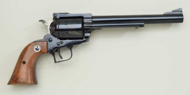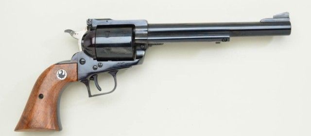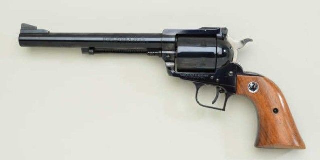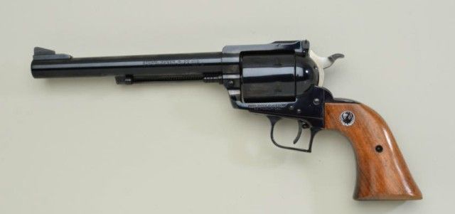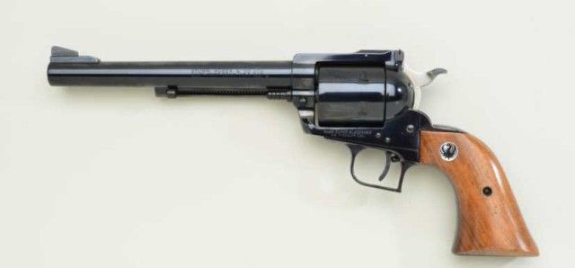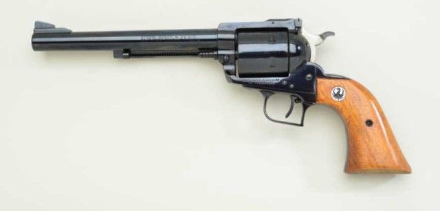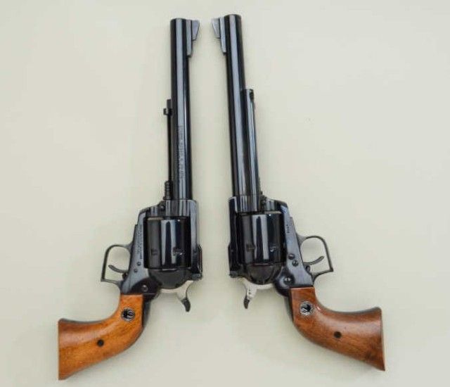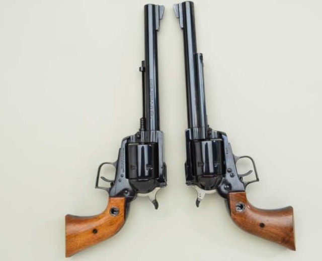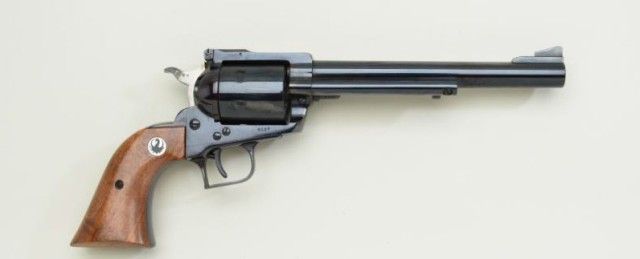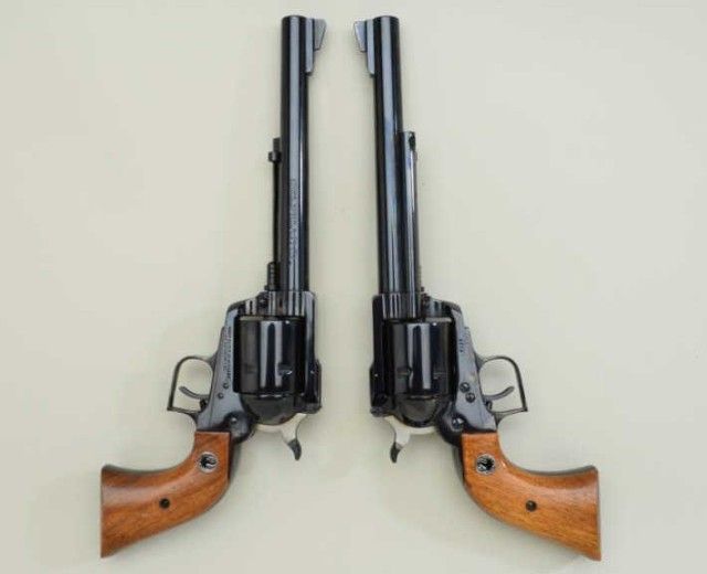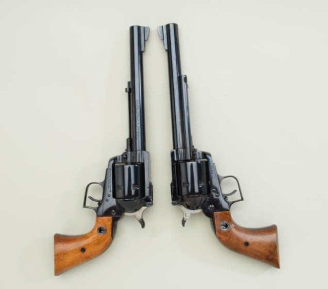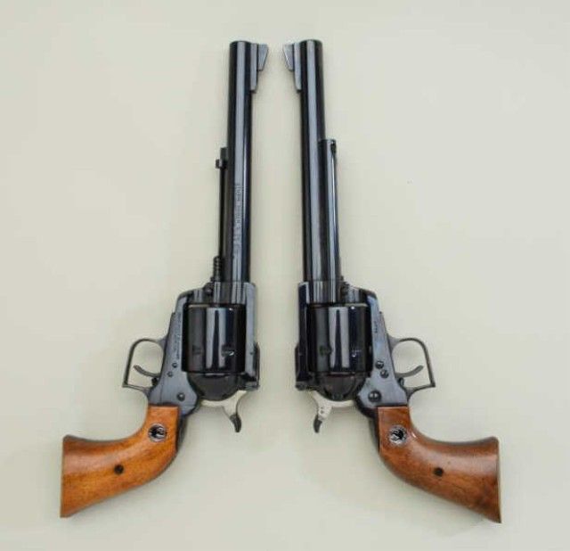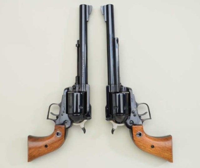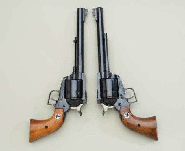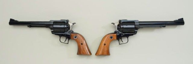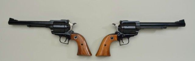 Pair of Ruger super black hawk 44 magnum caliber single action revolvers in early production range 7-1/2" barrels, high polished blue finish, serial #'s 6128 &6129. The pair are in excellent condition in their original boxes with paperwork showing no evidence of firing but slight index line from cocking. Each pistol is 99% plus, the boxes are the older crème color with super black hawk label glued in lid. Butterfields tagattached when sold as part of Bill Ruger collection. Robert E. Petersen collection. Est.;$1,750-$3,500.