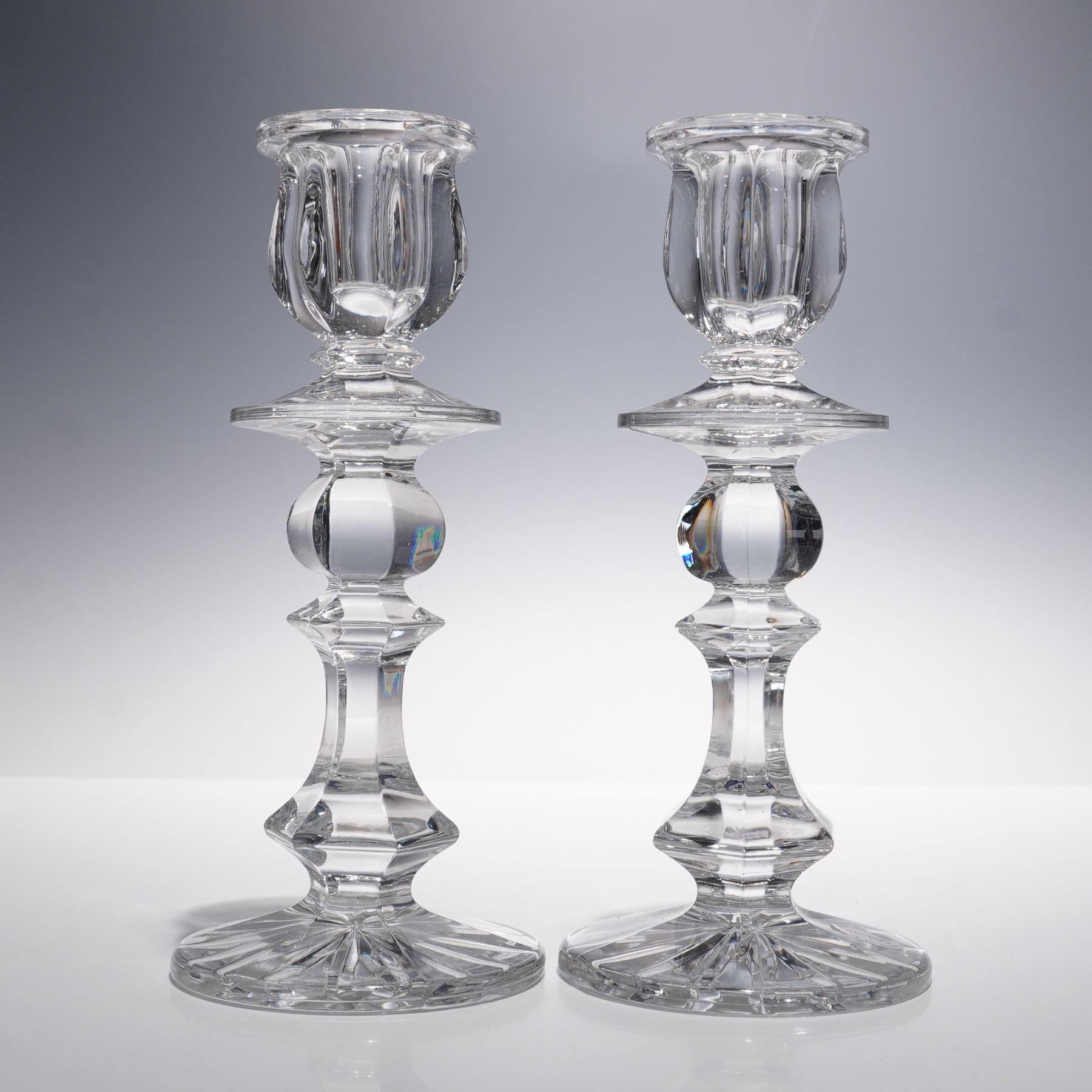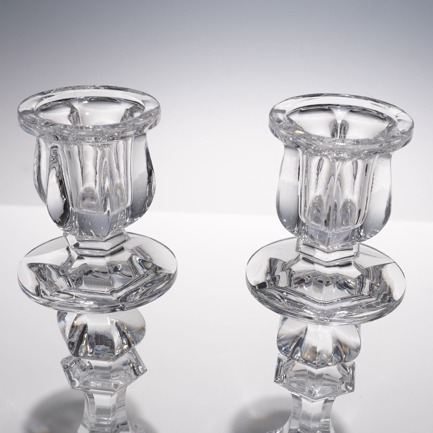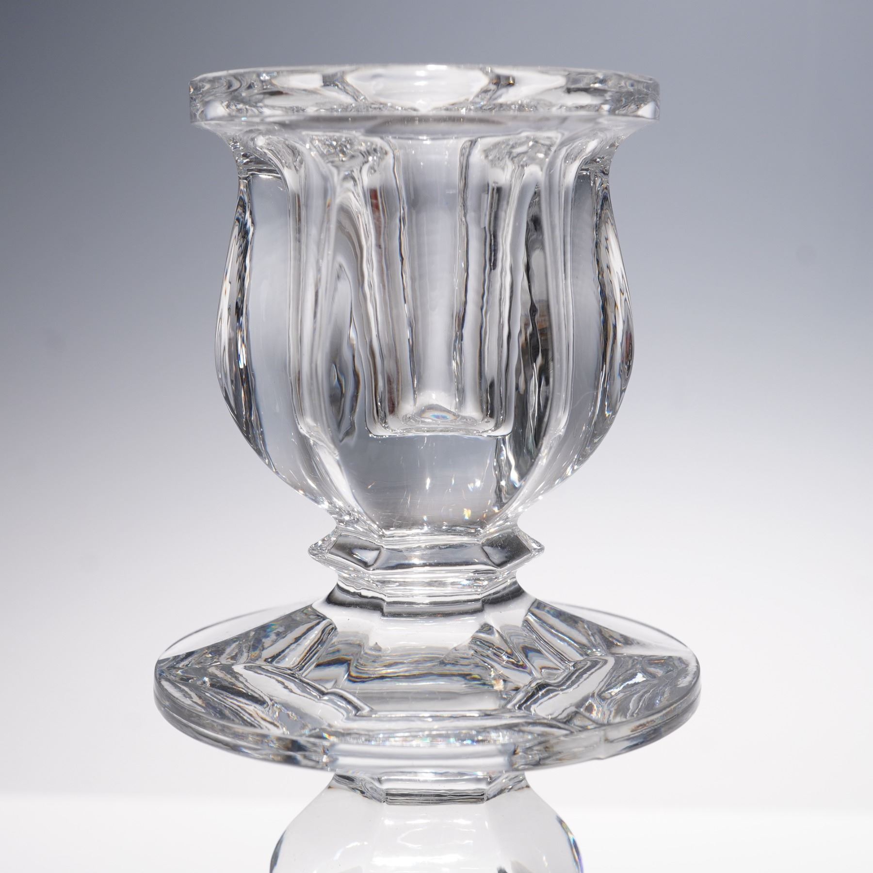 A pair of hand crafted Russian crystal candle holders, composed of high quality 24% lead crystal. Designed with classical architectural symmetry, deeply fluted base radiating into a faceted stem with a baluster shaped knop and a flaring, multipaneled candle cup. Handmade Crystal, Made in Russia, Gusevskoi Crystal Factory (in Cyrillic) foil label.