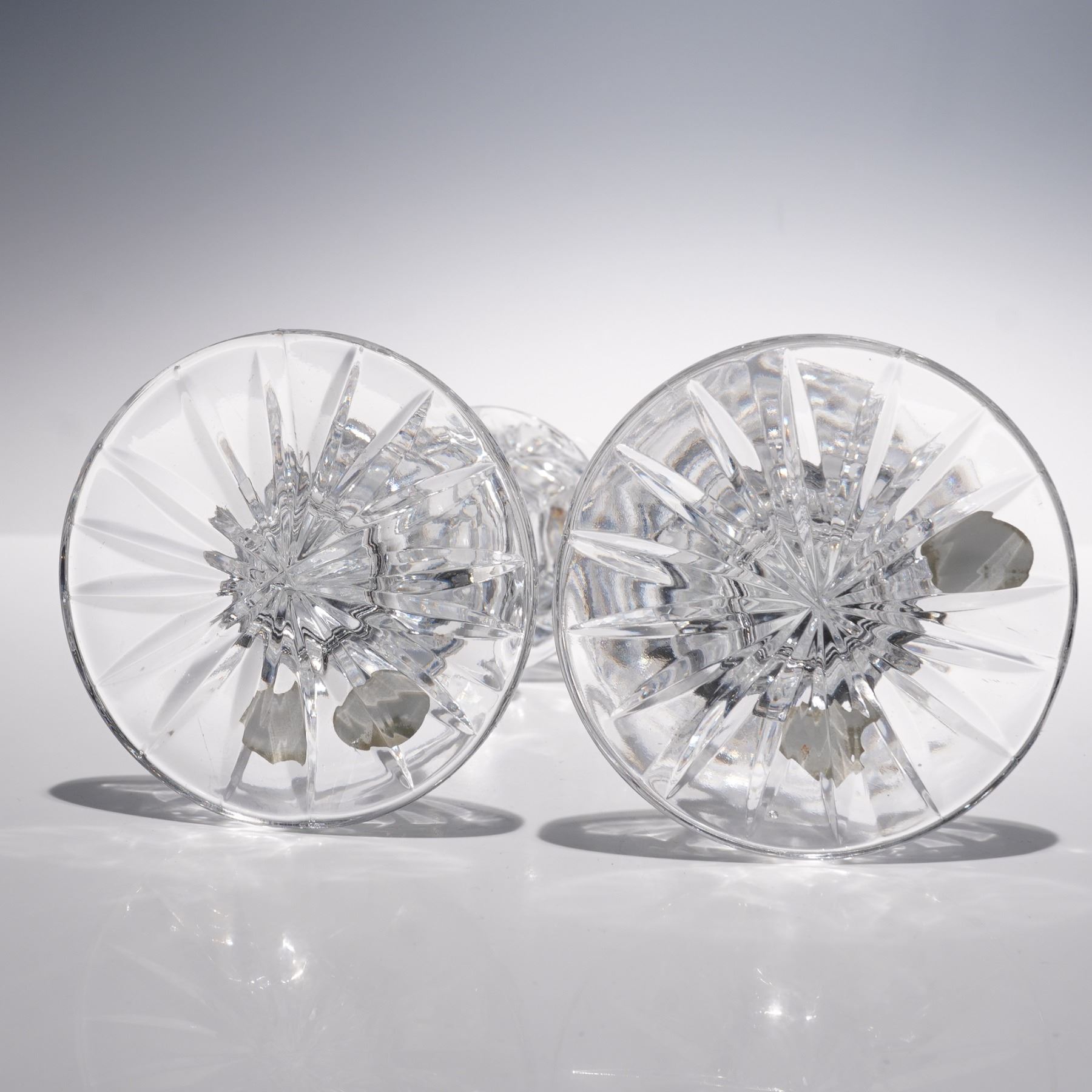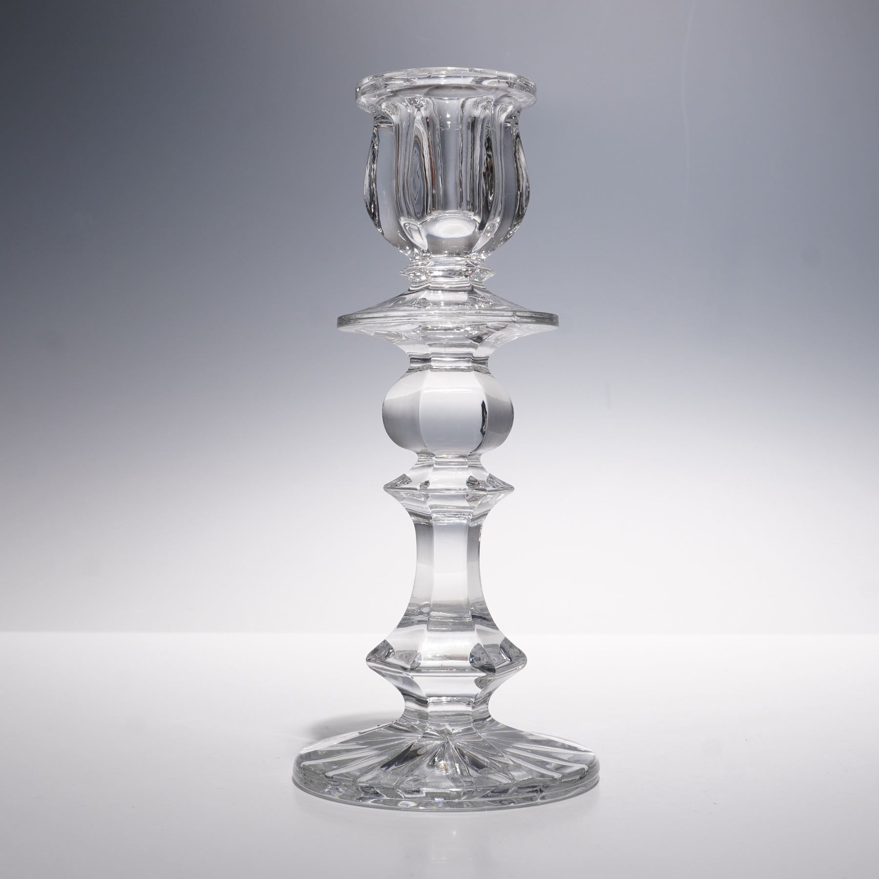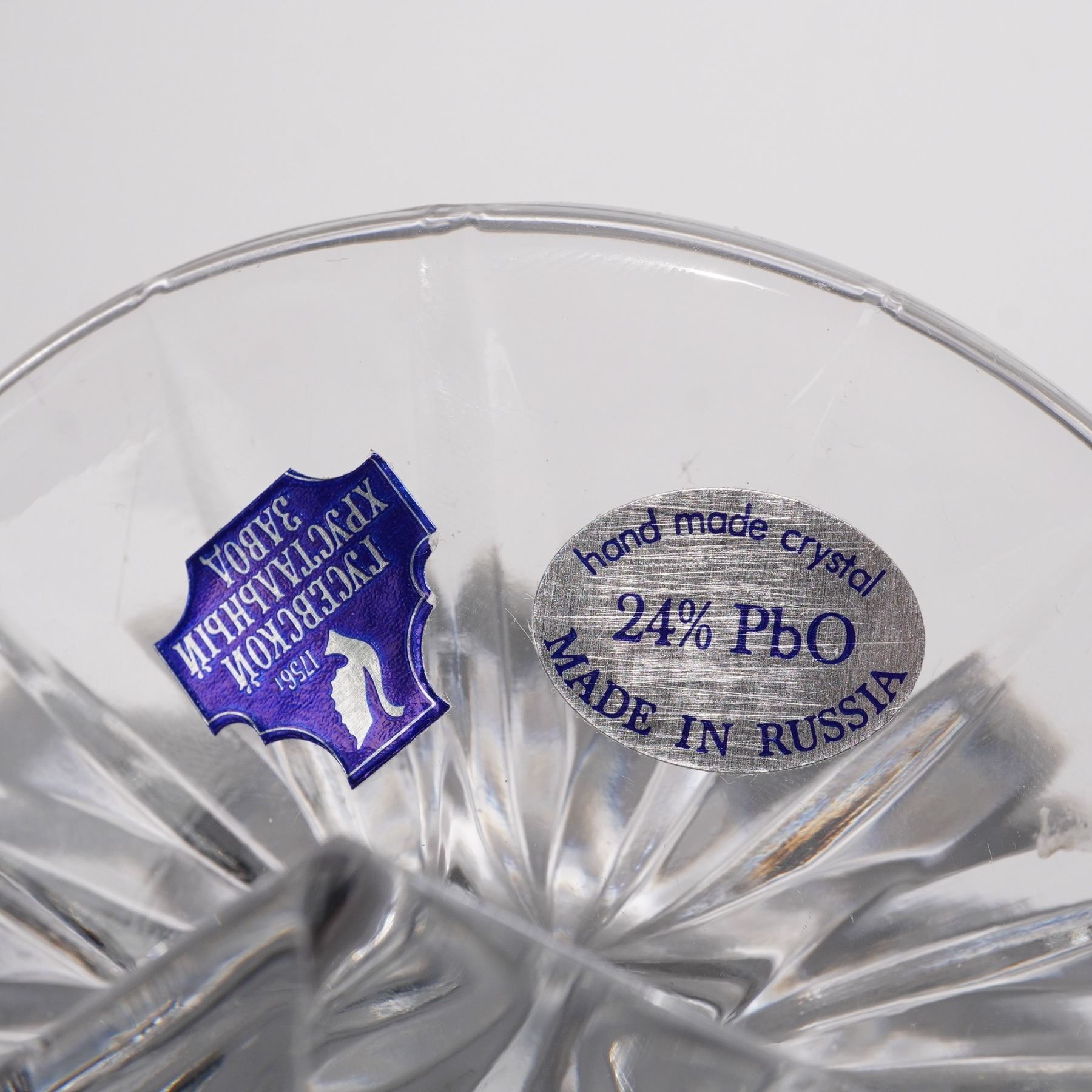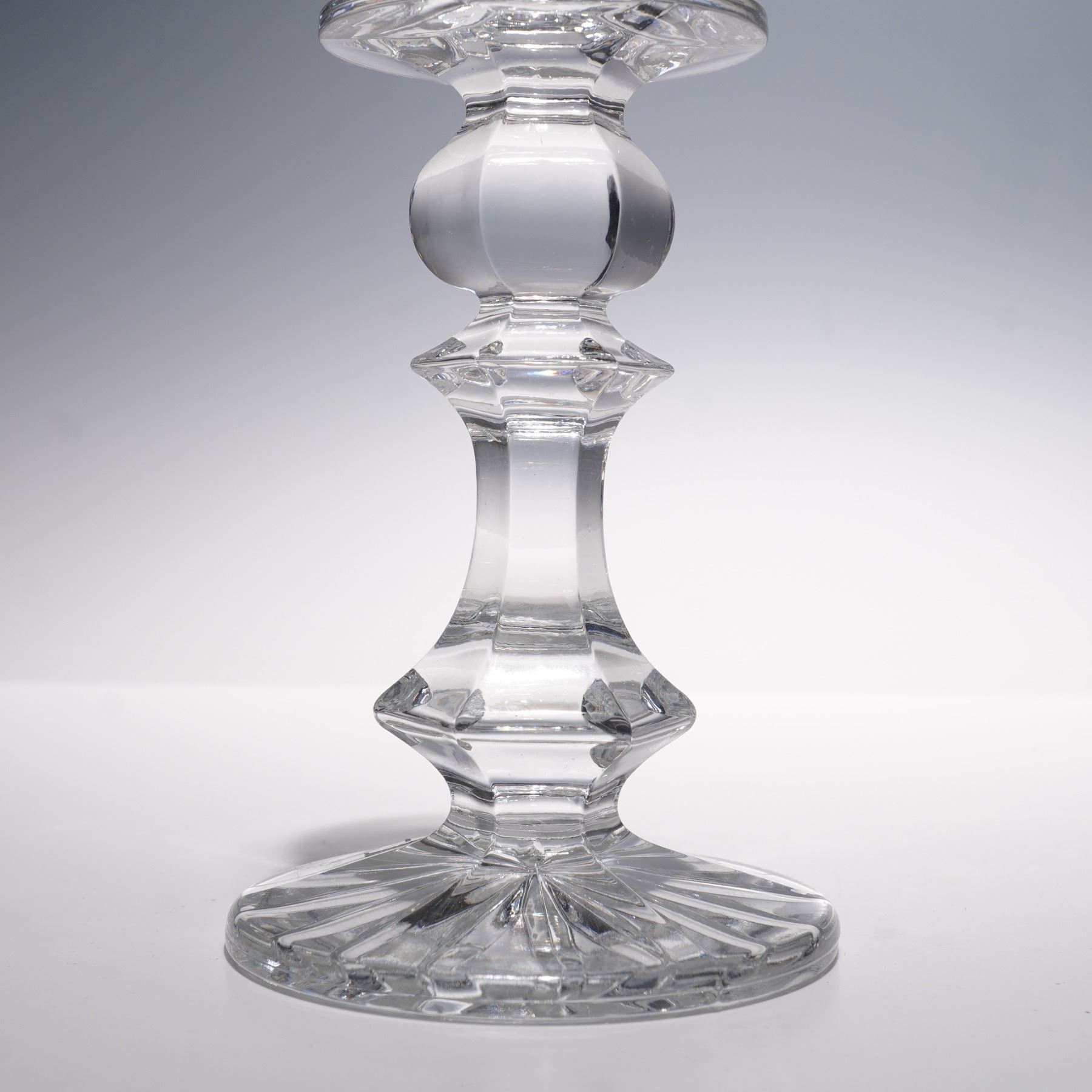 A pair of hand crafted Russian crystal candle holders, composed of high quality 24% lead crystal. Designed with classical architectural symmetry, deeply fluted base radiating into a faceted stem with a baluster shaped knop and a flaring, multipaneled candle cup. Handmade Crystal, Made in Russia, Gusevskoi Crystal Factory (in Cyrillic) foil label.