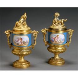 Pair of SFvres-Type Ormolu Mounted Covered Urns
