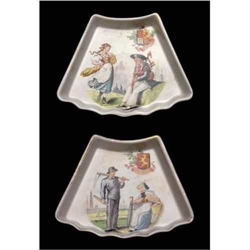 Charming pair of Sarreguemines transfer-printed section dishes from the Nations series. One represents England and the other Belgium. Each is decorated with couples in their national costumes and the respective country's coat of arms. Both are marked on the underside with the mark Sarreguemines in cursive script, overlaid with the letters U & C (Utzschneider and Company), used in the 1868 - 1919 period. In good used condition with minor signs of wear and restoration. Please ask questions, request additional photos and shipping costs before buying.
