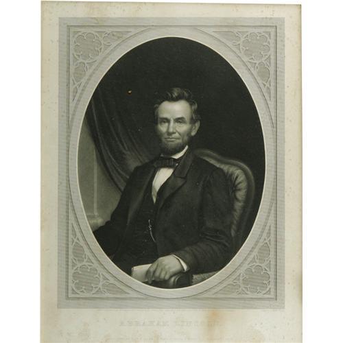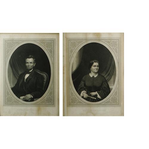 <B>Pair of Engravings of Abraham & Mary Todd Lincoln by Sartain.</B></I> Each engraving measures 11.5" x 15.25", framed to an overall size of 14.75" x 18.75". Samuel Sartain lived, worked, and died in Philadelphia, Pennsylvania. He was a well-known engraver of civic leaders, businessmen, and other notables who lived and worked in or around the Philadelphia area. Both of the portrait engravings offered here were accomplished in 1864. Each engraving shows noticeable foxing throughout, and some age toning. The frames are in good condition, with some chipping and scratching evident. Still, this is a wonderful pair of engravings of Lincoln and his first lady by a contemporary master craftsman.<BR><BR><b>Shipping:</b> Framed - with Glass, Medium (<a target="_blank" href="http://www.heritageauctions.com/common/shipping.php">view shipping information</a>)