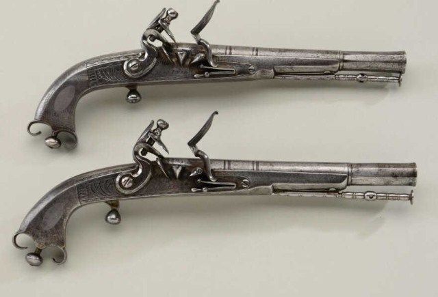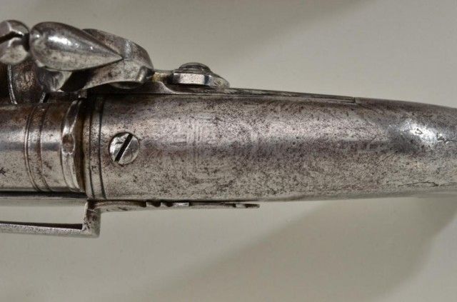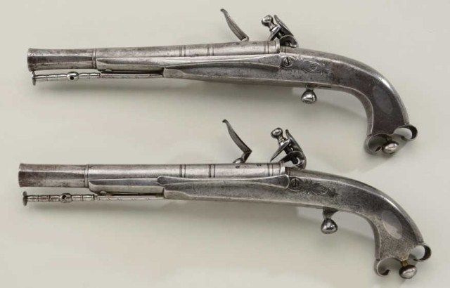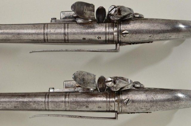 Pair of Scottish style Flintlocks pistols with rams horn shaped butts signed "MAC LEOD" with engraved locks, nicely silver inlaid stocks with etched decoration, flared muzzles in approx 60 cal. The pair measure 12-3/4"overall with 7-3/4" barrels. The breeches show British proofs and the locks have high quality water proof pans and rollers on the frizzens, circa late 18th to early 19th century. The pair are in very good condition with all original small parts and there is a Scottish coat of arms barely visible on the top portion of each stock surrounded by scrolls, crosshatch designs, thistles and other Scottish motifs. The original ramrodsand belt hooks are also retained. Pairs of Scottish Flints have all but vanished from the collectors market. Est.;$12,500-$25,000.