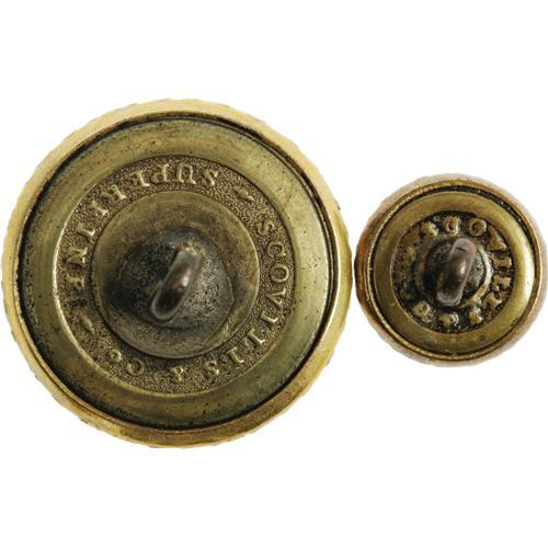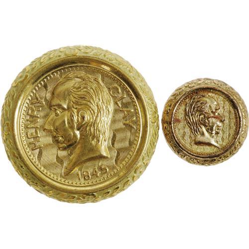 <B>Pair of Scovill Mfg. Co.Henry Clay Buttons.</B></I> These superbly made, heavily gilt buttons carry a bust of Henry Clay and would have been worn by the great statesman's ardent disciples prior to the Civil War. The first, a 23mm coat button, reads "Henry Clay 1845" around the portrait. It has an ornamental rim and a high quality brass back with stand-up shank. Listed as Albert's 206A and very rare. It's smaller 13mm companion is of similar construction and quality, however lacks Clay's name and date. Both buttons are in excellent condition.<BR><BR><b>Shipping:</b> Miscellaneous Collectibles, Smal (<a target="_blank" href="http://www.heritageauctions.com/common/shipping.php">view shipping information</a>)