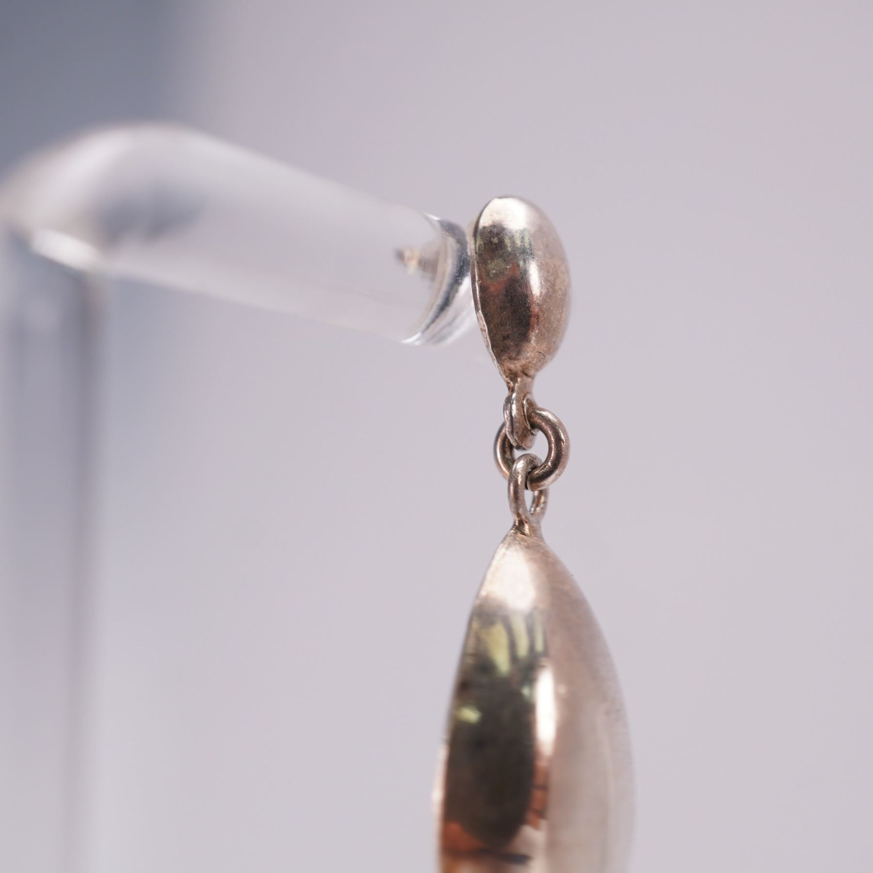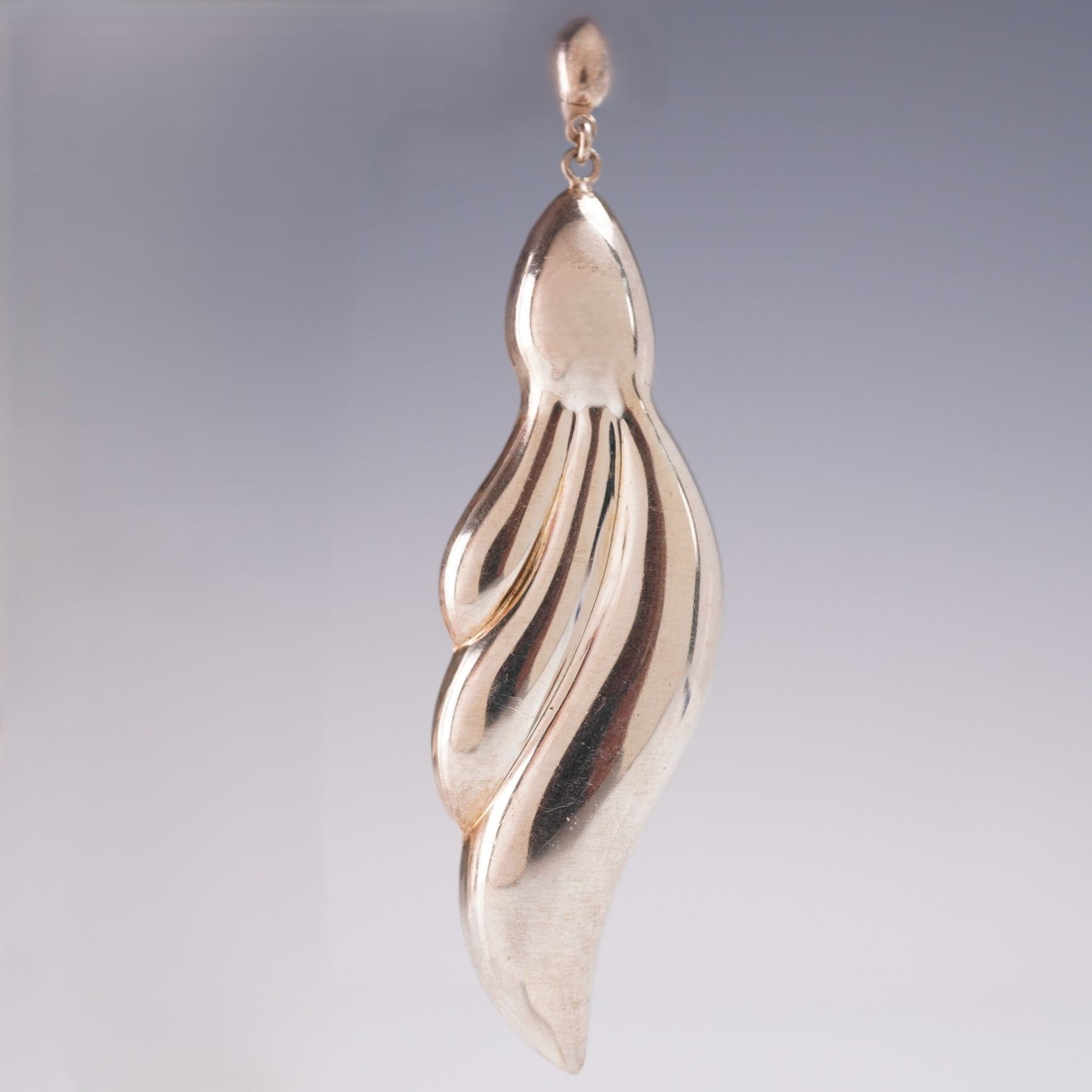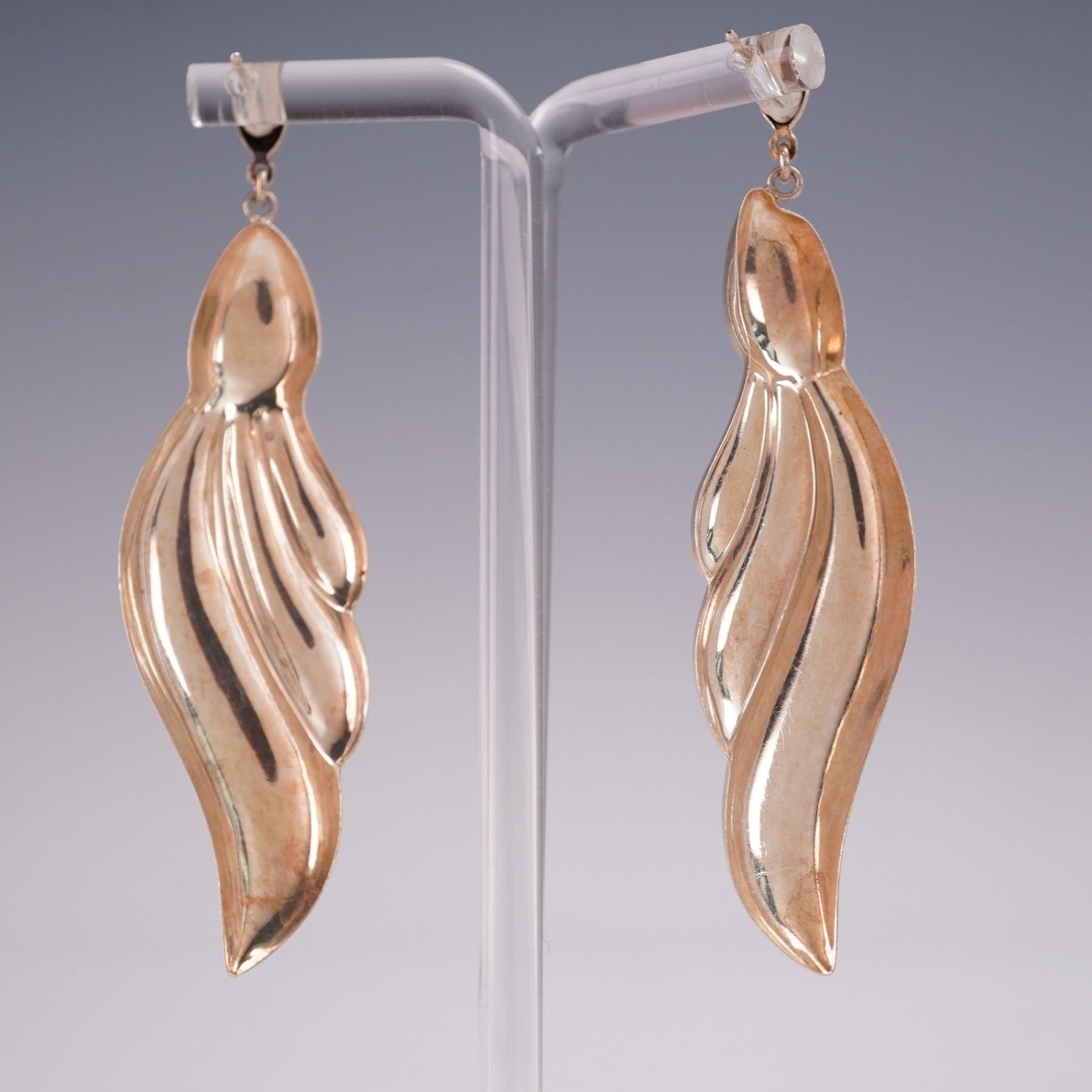 A bold pair of sculptural abstract drop earrings in polished silver-tone metal. Each earring features a dramatic, flowing form reminiscent of stylized leaves or flames, suspended from oval dome posts with clip backs. The organic, curvilinear design gives the pair an eye-catching, modernist aesthetic.