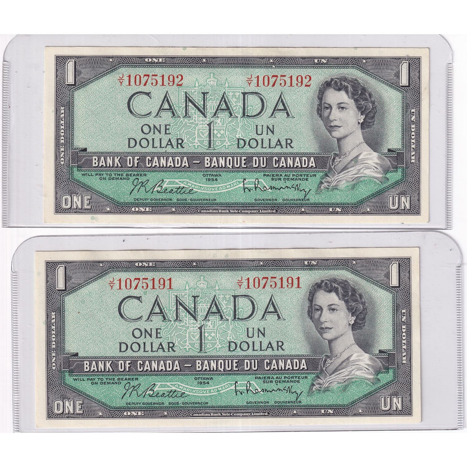 Pair of Sequential 1954 Bank of Canada $1 Modified Banknotes. Beattie-Rasminsky S/N: J/Y1075192/191. Both notes AU or better! 2pcs
