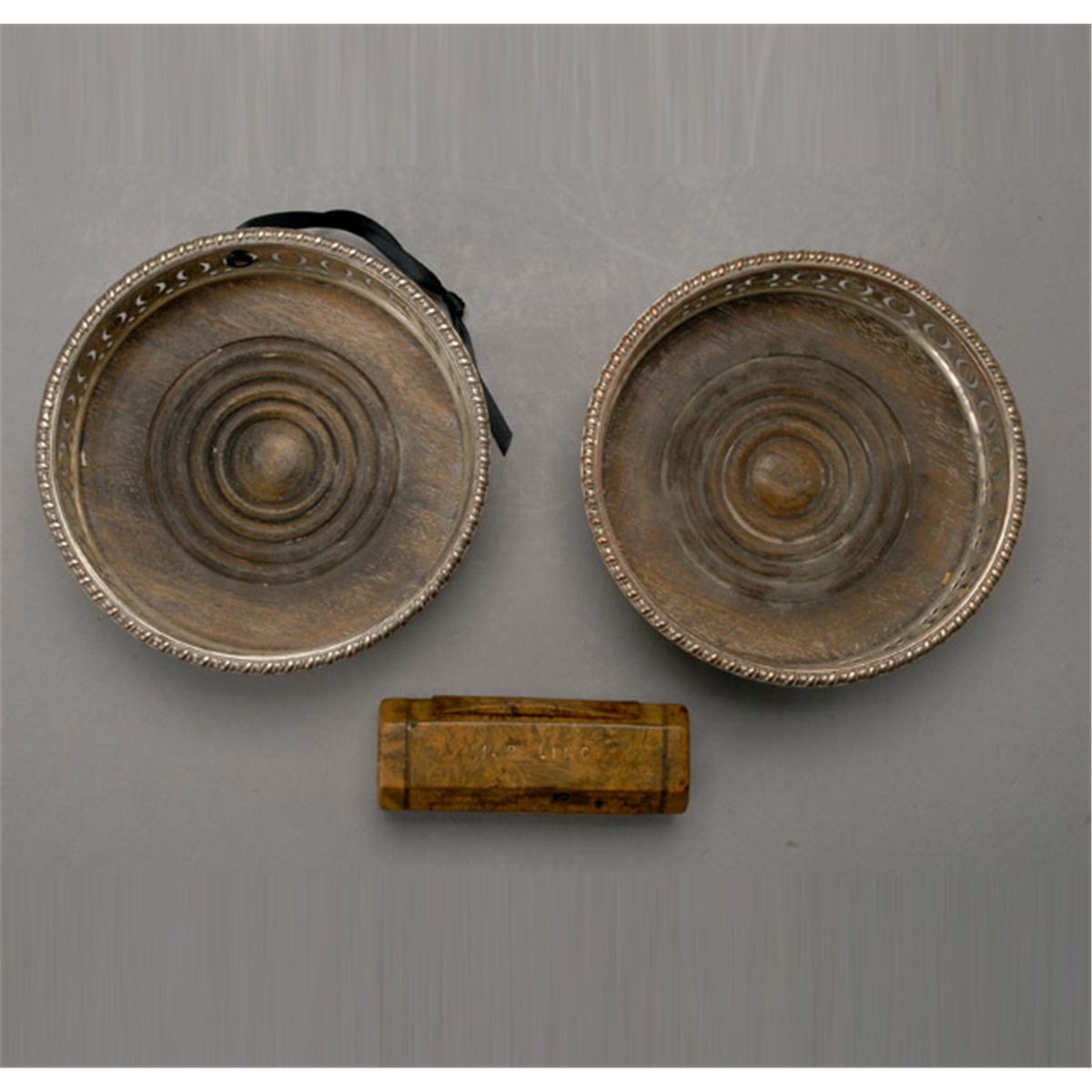 Pair of Sheffield Wine Coasters and a Wood Inlay Double Sided Master Snuff (3) {Length of snuff 3 3/4 inches}