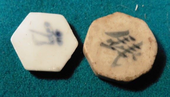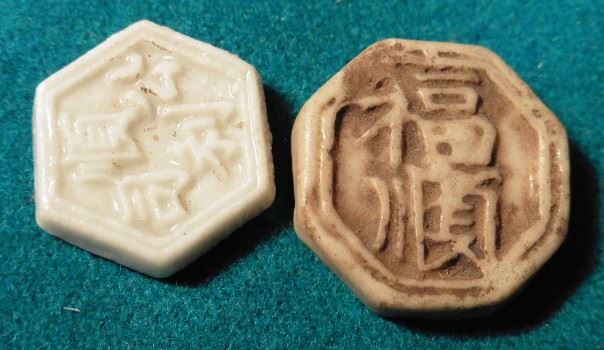 Pair of Siamese Gambling Tokens. Most likely used in Thailand. High relief Chinese scrip on obverse and blue delft Chinese figures on the reverse. Both different. Ca. 1800's.
