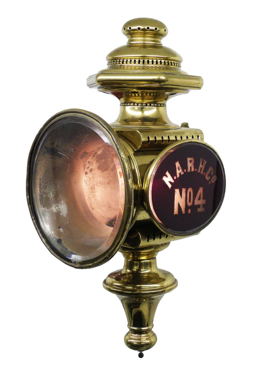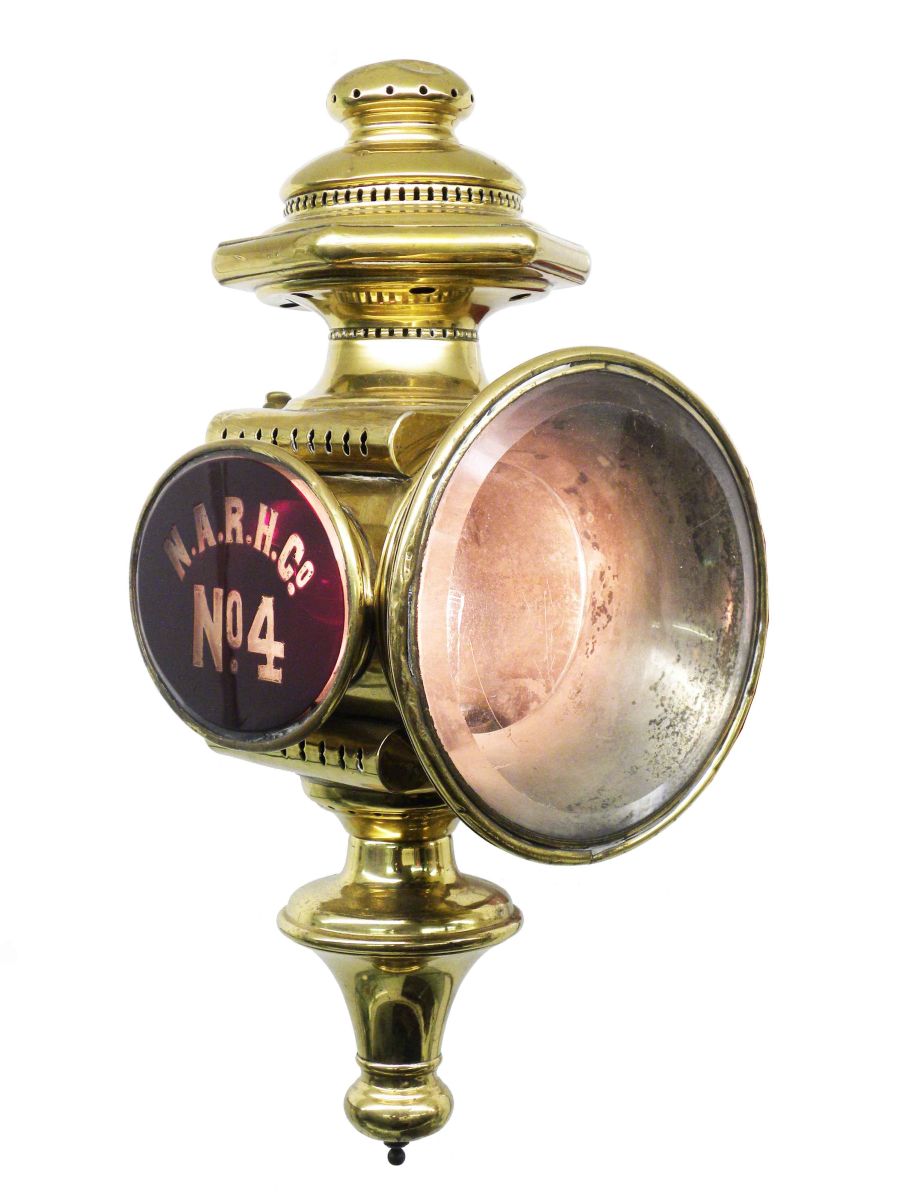 Pair of Side Fire Engine Lamps. N.A.R.H. Co. No. 4. Brass with ruby glass. Come with mounting brackets, have been electrified. Aprox 20 inches tall.