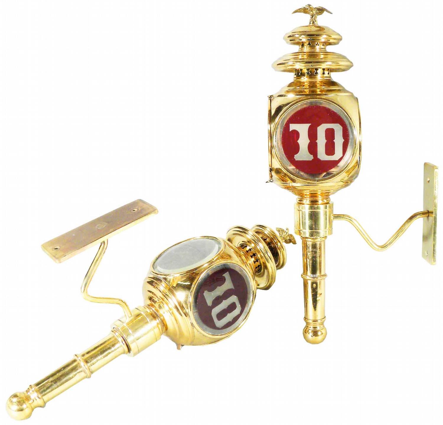 Pair of Side Fire Engine Lamps. Ruby glass "10". Each complete with burner and mounting brackets. No chips or cracks. Excellent condition. Each measure 20 inches tall.