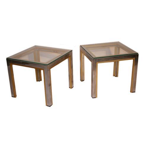 A wonderful pair of square French side tables in brass, chrome, and glass.</em></td>