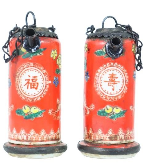Pair of Signed Chinese Porcelain Oil Lamps. Lamps are decorated with flowers and images of fish. Marks on bottom.
