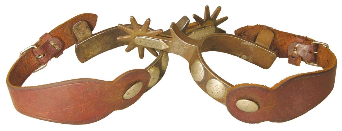 Pair of Silver Overlay Spurs with engraved conchos and original straps. Very good original condition. 2 inch rowels.