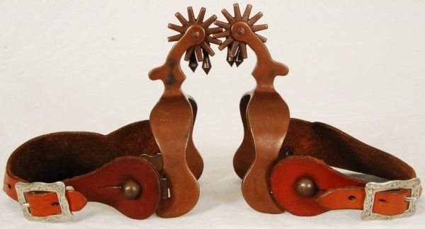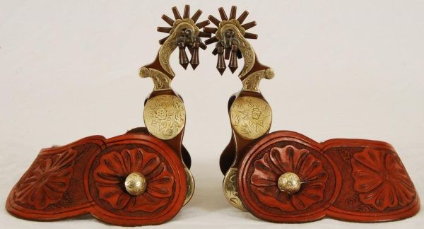 Silver single mount, 1-5/8" 12 point rowels, jingle bobs, flower stamped straps with silver buckles.