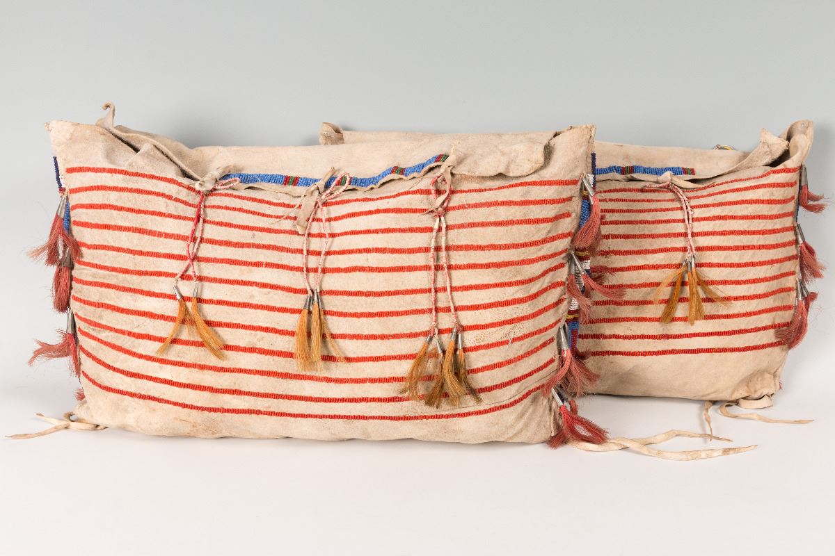 Pair of Sioux Beaded Possible Bags. 14" x 23" at widest point. Fabulous and difficult to find pair of full-sized bags. Line beaded in front with geometric designs on flap and along sides. Adorned with horsehair-stuffed tin cones and quilled drops terminating in horsehair-stuffed tin cones. Circa 1870.