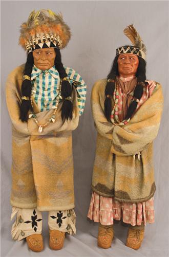 Pair of Skookum Dolls. Female is 34" tall. Male is 36" tall. c.1930s. Excellent condition. (est $3,000-4,000). Provenance: Otto Ernst Saddle Shop, Sheridan, Wyoming.