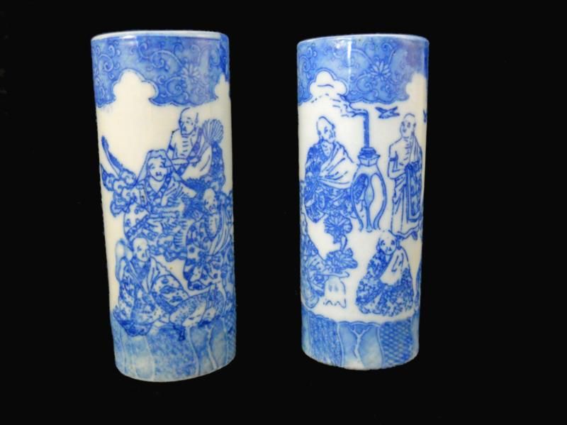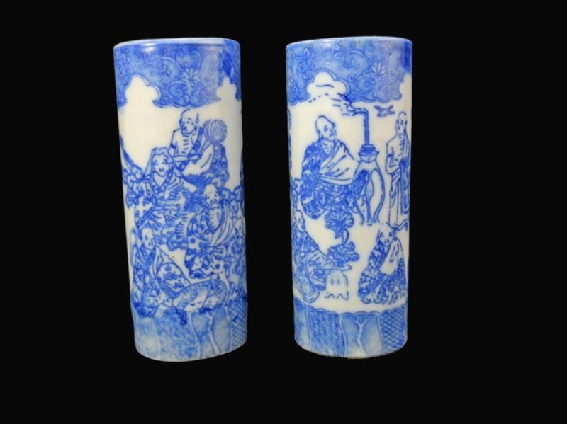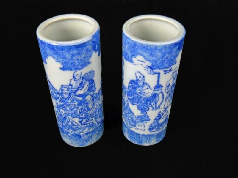 Pair of blue and white transfer printed small cylindrical vases measures 5 inches tall 2 Inches Wide