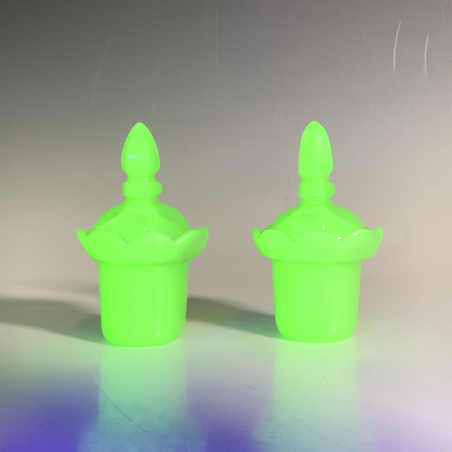Set of two chic small uranium glass jars featuring a soft green hue and a scalloped cut-glass rim, complemented by cut-glass lids with faceted cone-shaped handles. Issued: 19th century
