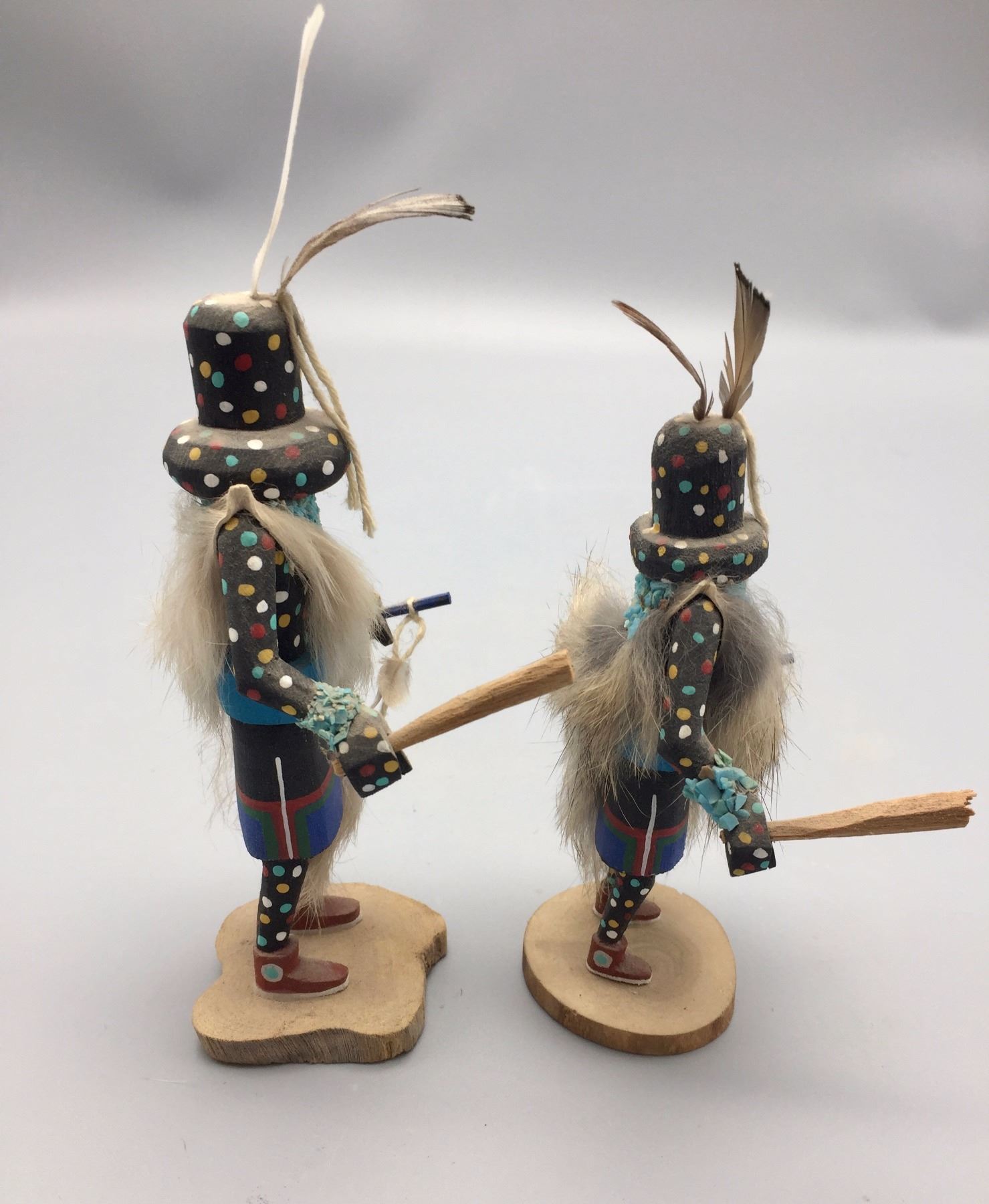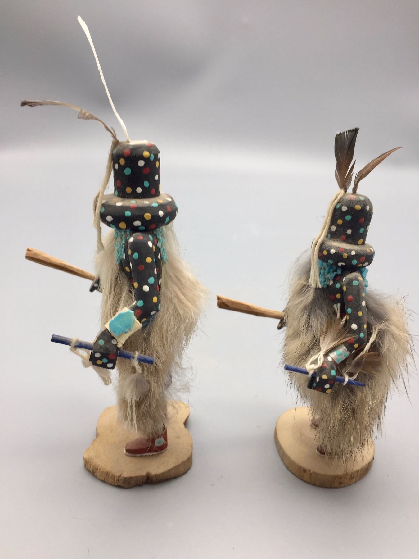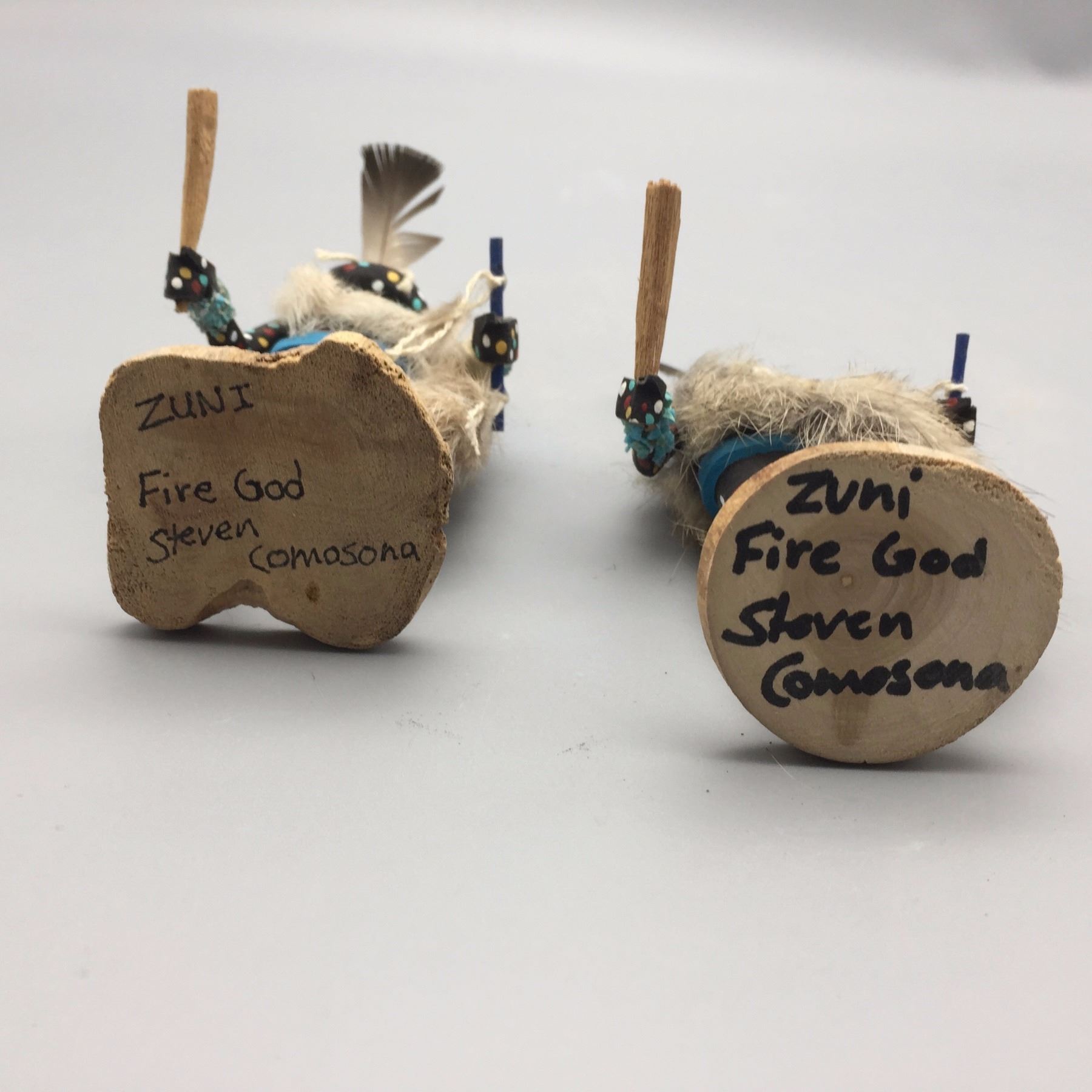 Maker: Steven Comosona, Zuni. Approx. Age: Fairly modern. Size: Both measure approx. 3” at their widest and 5” to 6” h. Additional Info: Pair of small Zuni Fire God kachinas. Condition: Good for it’s age, NOS from a dealer who is retiring. Please look closely at the pictures - they are an important part of our description. Shipping: There will be a $7 handling / packaging fee for shipping this lot. The actual cost of postage will be added on top of that.