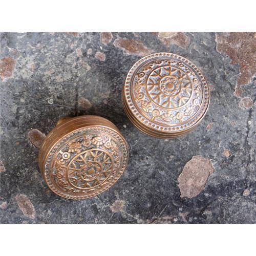 </font></strong>Pair of solid brass doorknobs with symmetrical Eastlake design.</font>