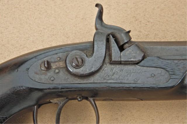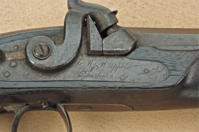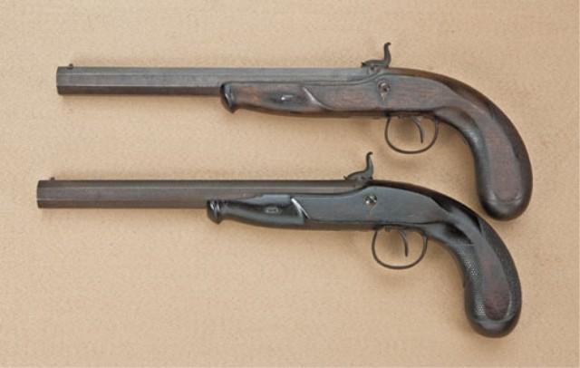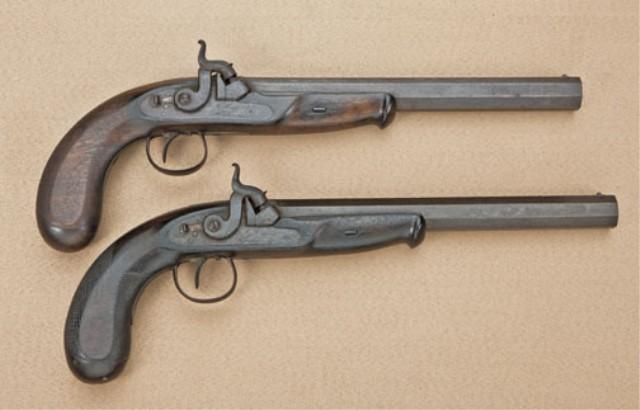 Pair of Southern dueling/target pistols signed in script on locks J. M. Happoldt, Charleston SC, with period American made unusual cabinet style casing. The pistols measure approx. .38 caliber smoothbore with medium to heavy weight octagon barrels measuring 9-7/8” in length. 15-1/4” overall. The pair show good quality walnut half stocks with typical Happoldt styling with flattened grip and checkered sides, plain iron mounts, single set triggers, keyed barrels. The pistols show a deep brown patina finish with some light erosion and pinprick pitting just starting. The stocks are good. One pistol shows some darkening from oiling and a loss of wood at top edge, approx. 1/4” by 1/2 on left side. Its" mate’s stock is slightly better, just showing even wear and use. The pair are contained within an interesting American made cabinet type casing with dovetail corners, good cabinetry work, and is made to stand up vertically or possibly attached to a wall. The interior of the case is lined in a coarse felt or baize which is glued over wood. The interior of the case is in good condition showing some mothing and fraying and is definitely genuine to the 19th century. There is a large