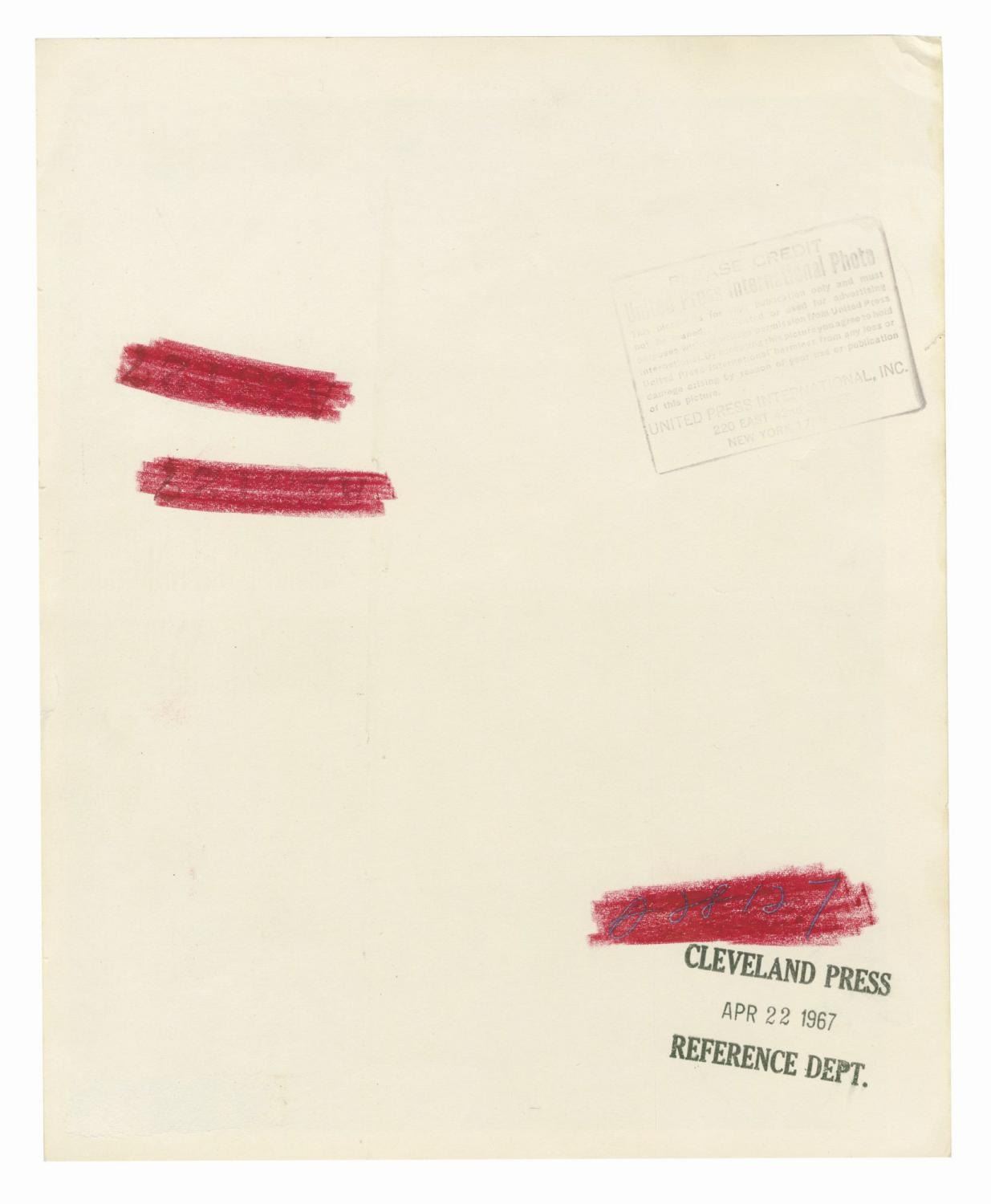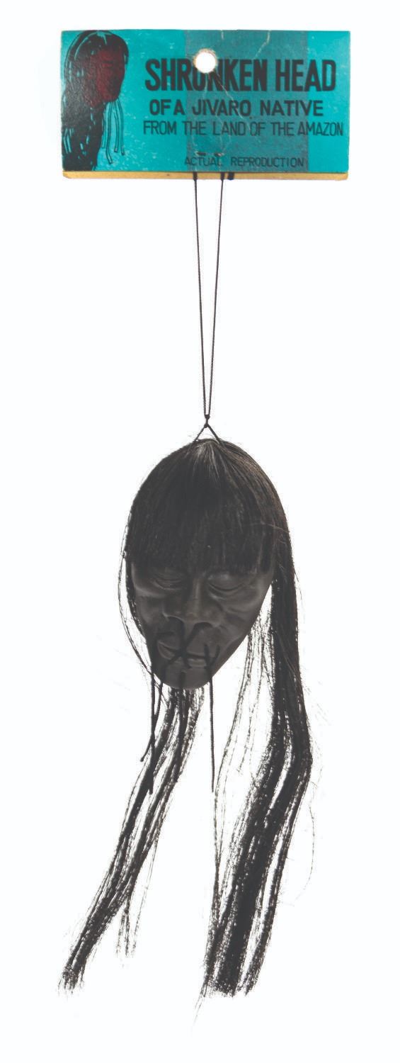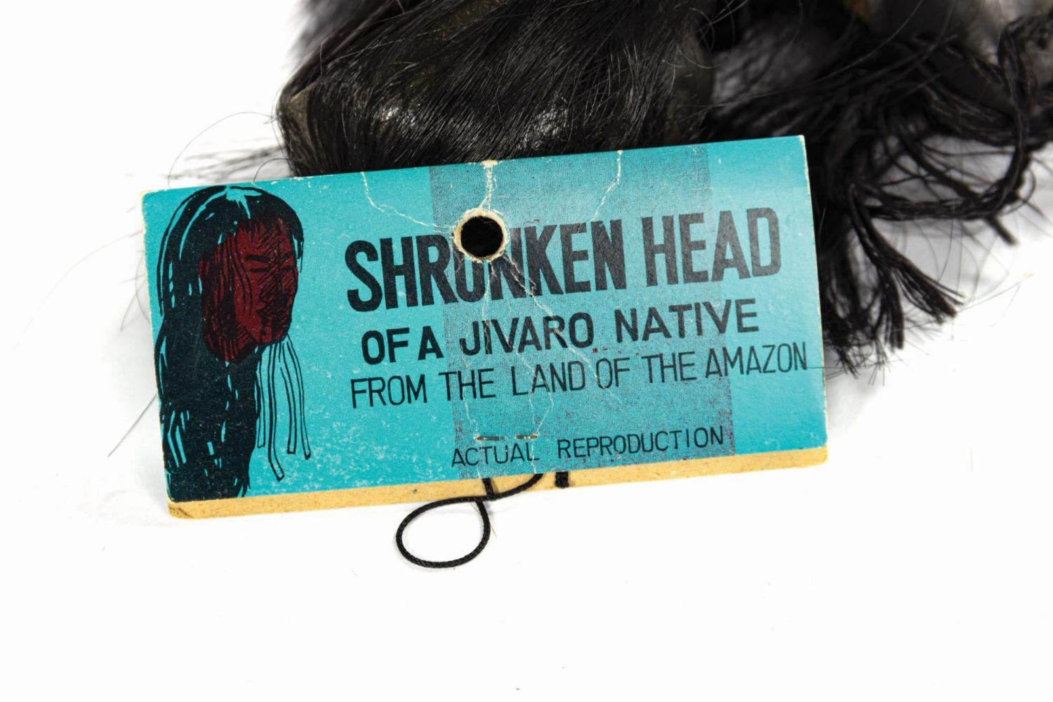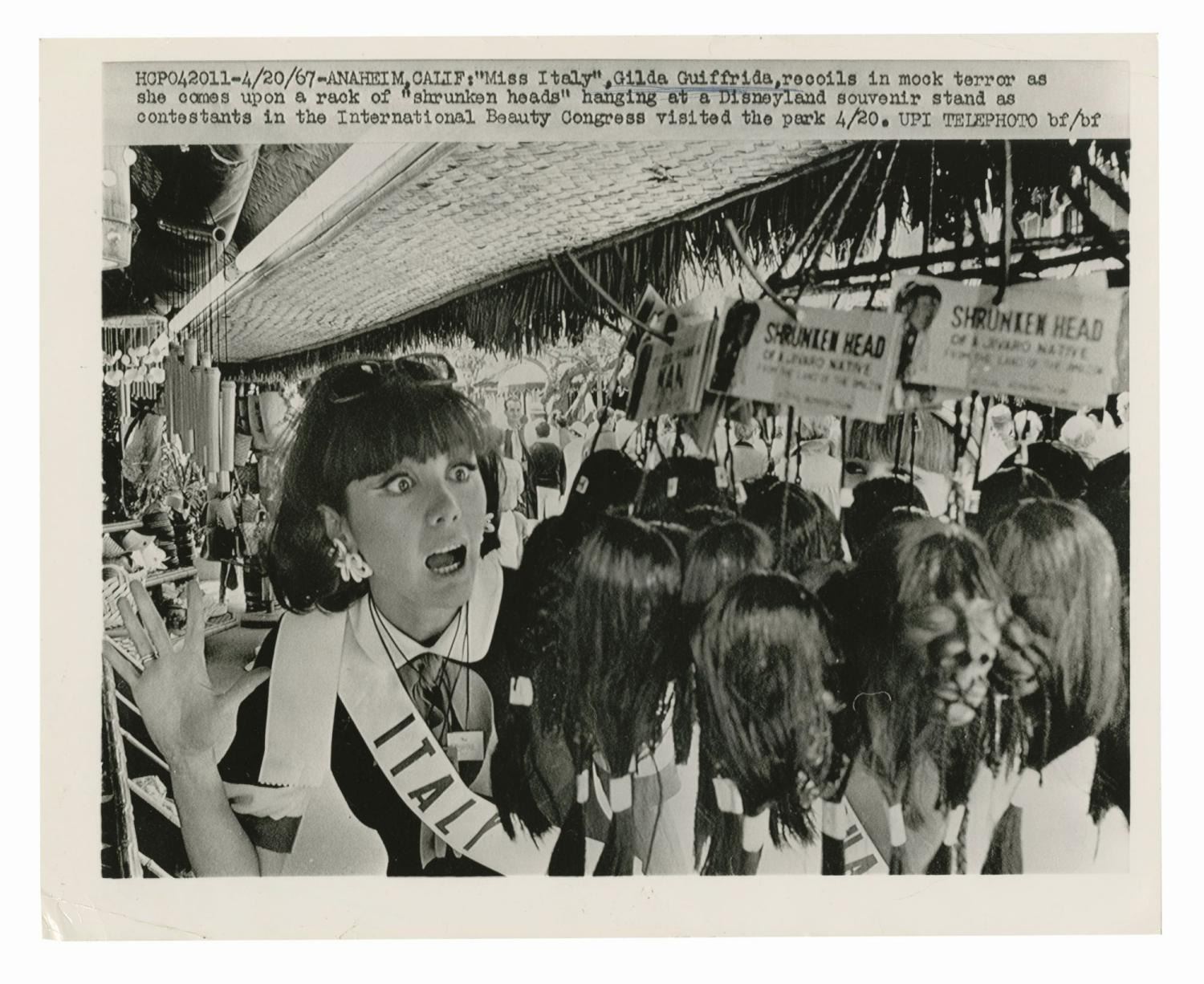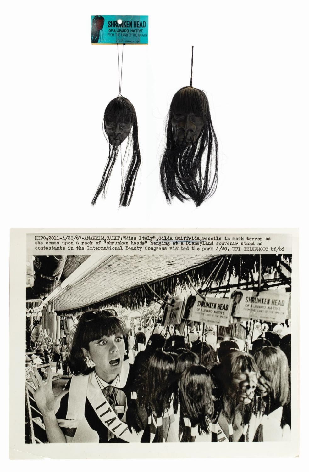 (Disneyland, c.1960s) A pair of "Shrunken Head of a Jivaro Native" souvenirs from Disneyland's Adventureland. Constructed of molded rubber, one head retains the original carding, which reads, "Shrunken Head of a Jivaro Native from the Land of the Amazon Actual Reproduction" on one side, and "It's good to have a man around the house" on the other. Also included is a vintage gelatin silver 8"x10" press photograph dated 1967 depicting Miss Italy pageant winner Gilda Guiffrida reacting in mock horror to a display of these shrunken heads at a Disneyland souvenir stand. The heads measure approximately 3"x2" and 2.75" deep and 3.25"x2" and 3.5" deep respectively. Both remain in very good condition. The carding exhibits some edge wear, spidering, and handling. The photo exhibits some surface spotting from the developing process and corner creasing.