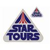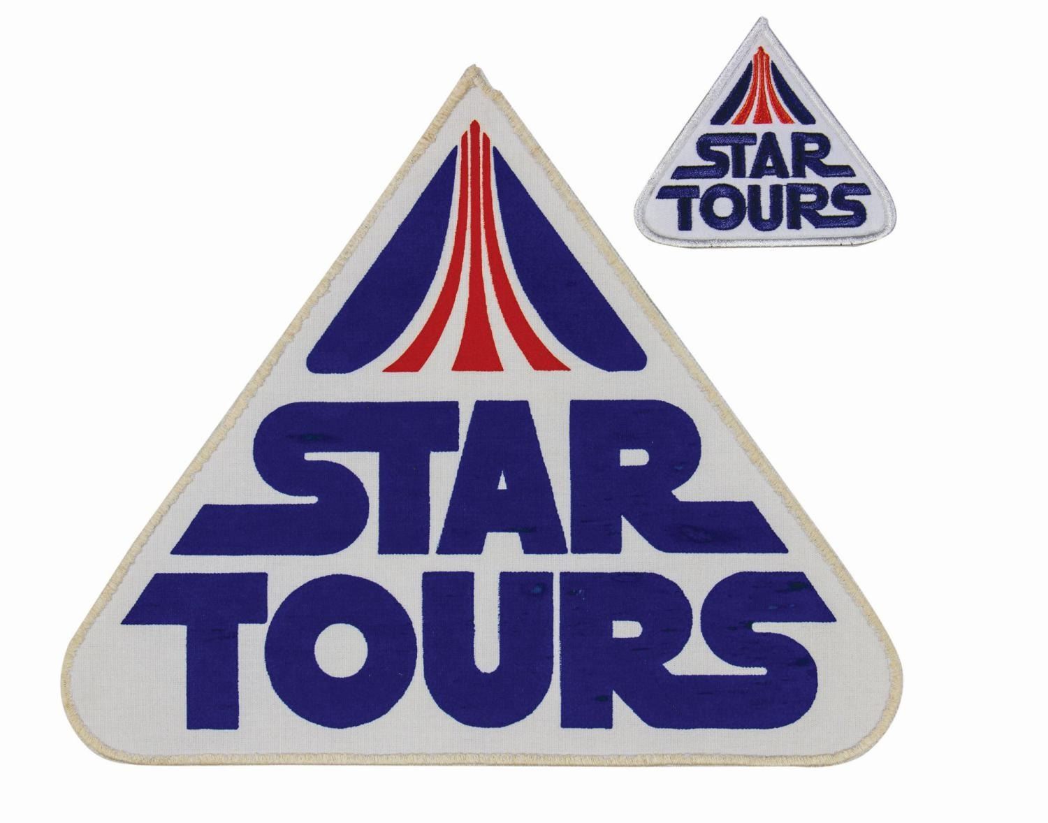 (Disneyland, c.1980s) A pair of cast member uniform logo patches created for the Star Tours attraction in Disneyland's Tomorrowland. Both patches are triangular with rounded bottom corners and feature the Star Tours text logo in navy blue and the graphic logo in navy and orange. The smaller embroidered patch would have been applied to the sleeve of a tunic or jacket and the screen-printed patch would have been affixed to the back of a jacket. Measuring 3"x3.5" and 9.25"x11.25" respectively, the patches are in very good unused condition. The back patch exhibits some surface wear in the lettering.