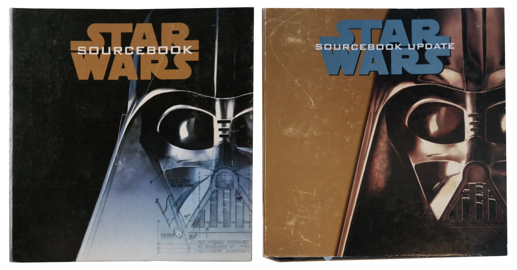 (LucasFilm, 1996-98) A very rare pair of promotional material books titled "Star Wars Sourcebook" and "Star Wars Sourcebook Update". These books were created by LucasFilm's Licensing Department and contain an incredible amount of logos, graphics, character artwork, and much more relating to the "Star Wars" original trilogy. These books were used as comprehensive resource materials to help in the creation of "Star Wars" themed products in the 1990s. There are over 300 between the two Sourcebooks, with each binder measuring 11.75"x11.5". The condition is fair, with moderate cover wear to both binders from use, as well as some wear to a few of the inner pages from use. The first Sourcebook is missing its inner CD, however the Sourcebook Update has both of its inner CDs.