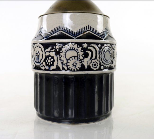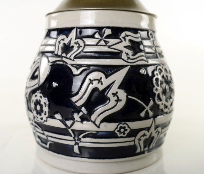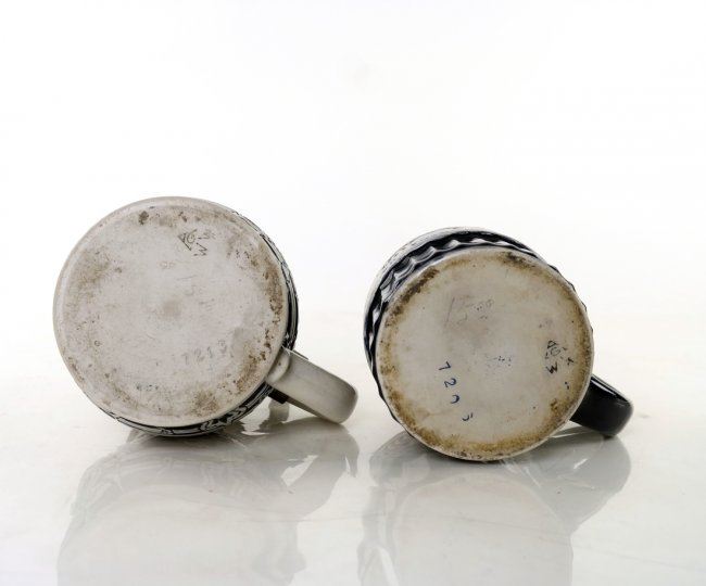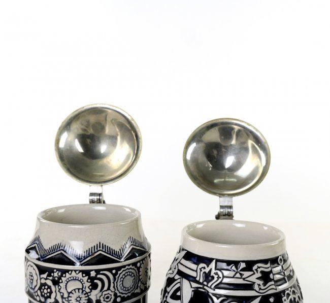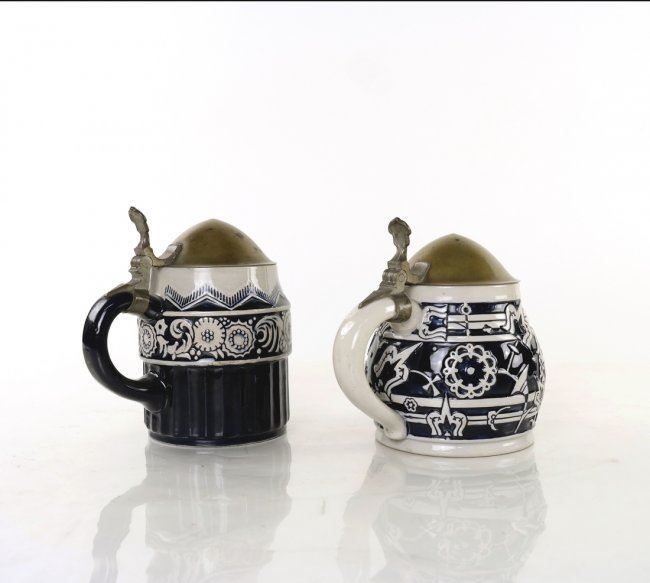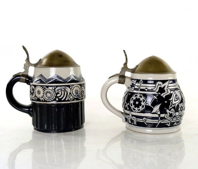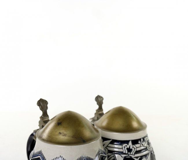 Pair of steins in stone and metal. [5 3/4" H x 4" D]. In good condition, some scuffs on metal top.