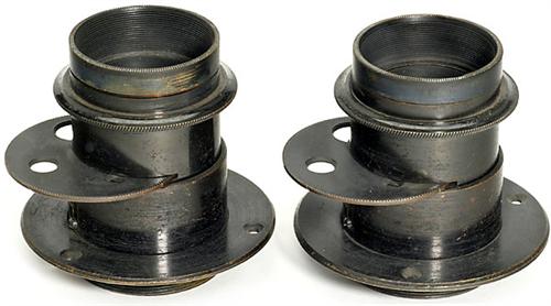 Pair of Stereo Lenses, c. 1880 Unmarked brass lenses, black paint, rotation diaphragm, focusing over slide, with connecting rings, height: 50 mm, diameter 46 mm. Rare!<Br>