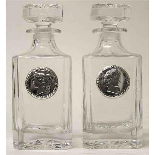 Included here is a pair of leaded crystal glass liquor decanters with neoclassical female and male medallions hand-crafted from sterling silver. They are relatively new and possibly of Italian origin. Each measures 9" high and 3.75" wide and deep and weighs 3 lbs. 9 oz. There are no blemishes of any kind to the silver and it appears they have never been used. There are no hallmarks. These items reside on the Upper East Side of Manhattan in New York city and may be seen by appointment.