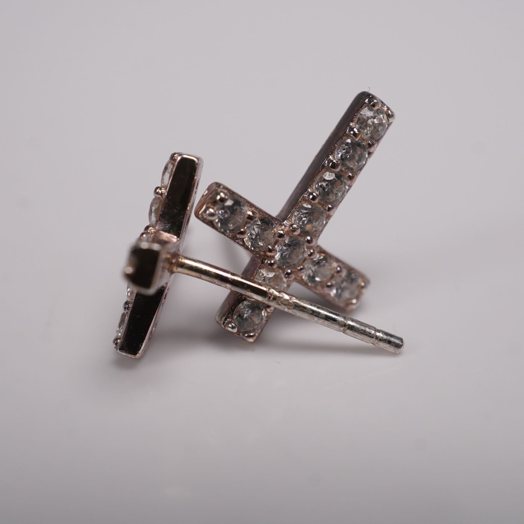 Stylish pair of sterling silver cross stud earrings, each set with a line of clear sparkling stones across the front. Marked 925 on the reverse for sterling silver. Classic in design, these earrings offer a timeless look suitable for daily wear or special occasions. Weight: 1.06g.
