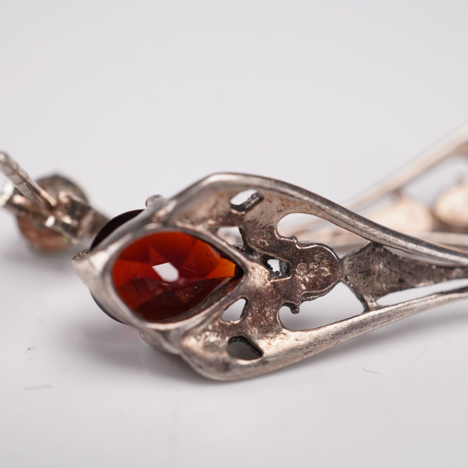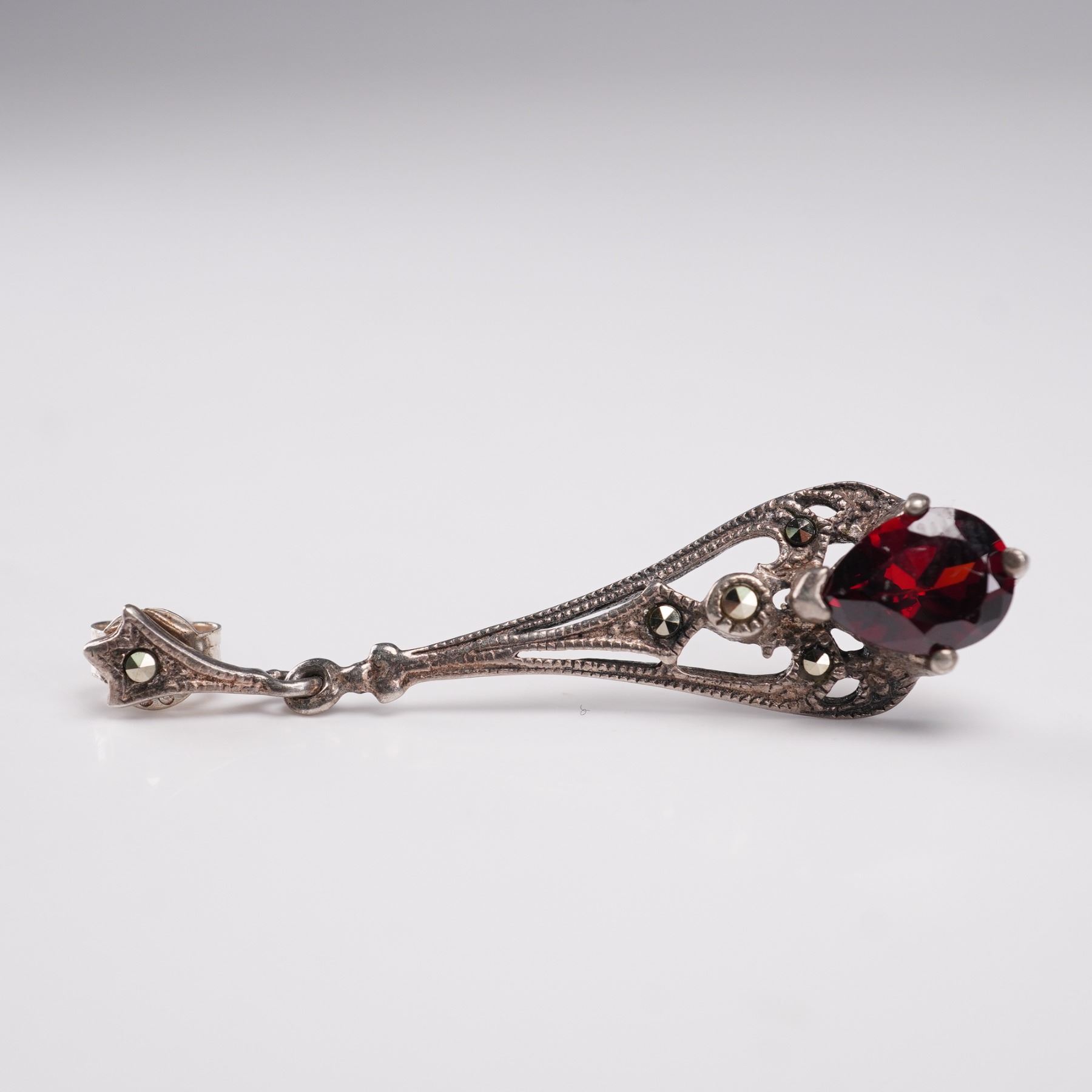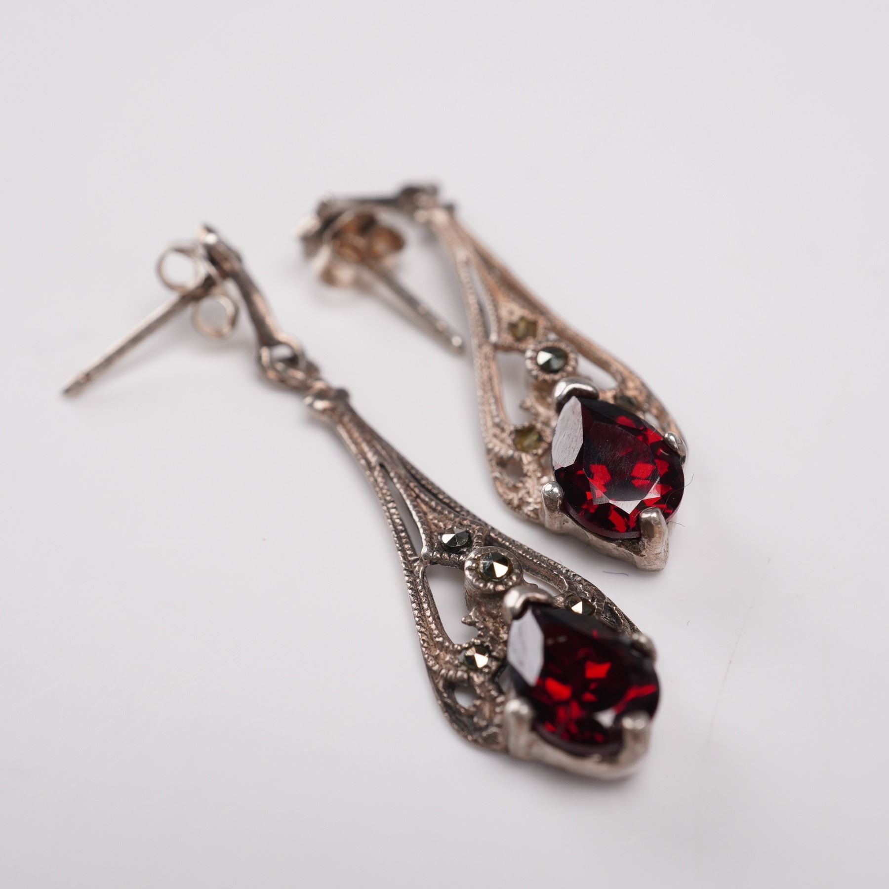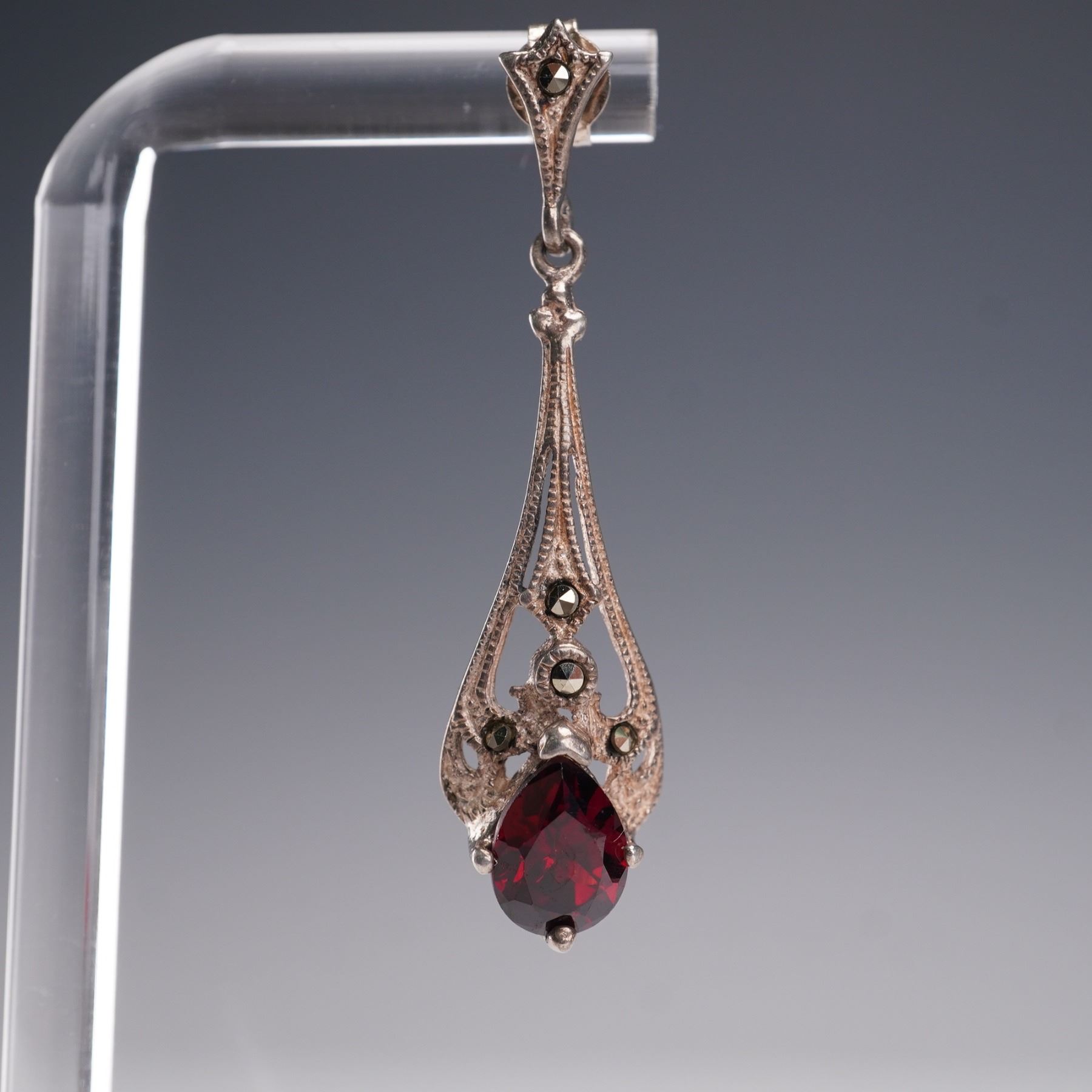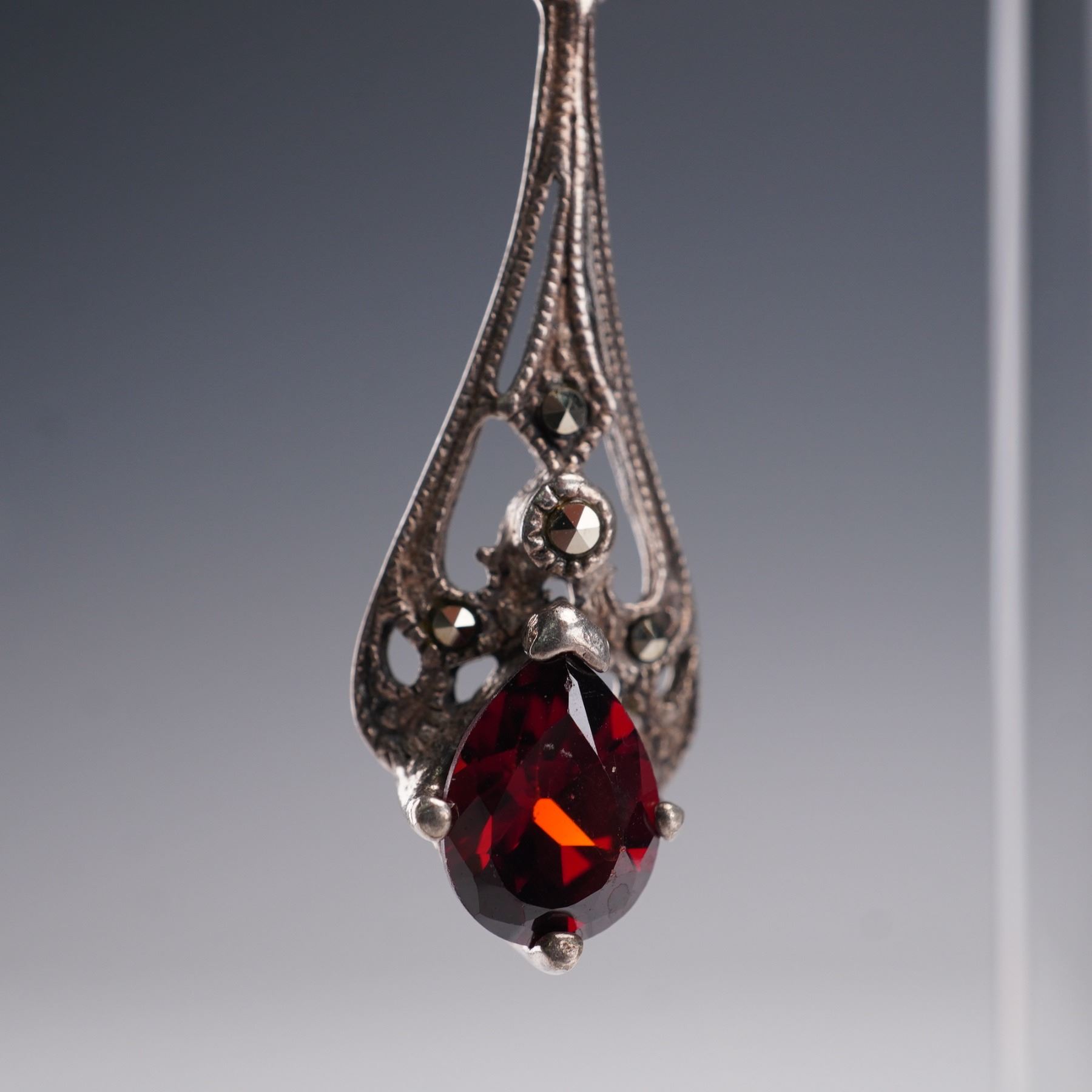 A refined pair of sterling silver drop earrings set with pear-cut garnets of deep red hue, accented by glittering marcasite stones within an ornate openwork design. The elongated form and delicate detailing enhance the vintage-inspired style, while the garnets provide a rich focal point. Marked 925 on the reverse for sterling silver, these earrings blend classic craftsmanship with timeless elegance, making them a versatile choice for both evening and daytime wear. Weight: 3.76g.