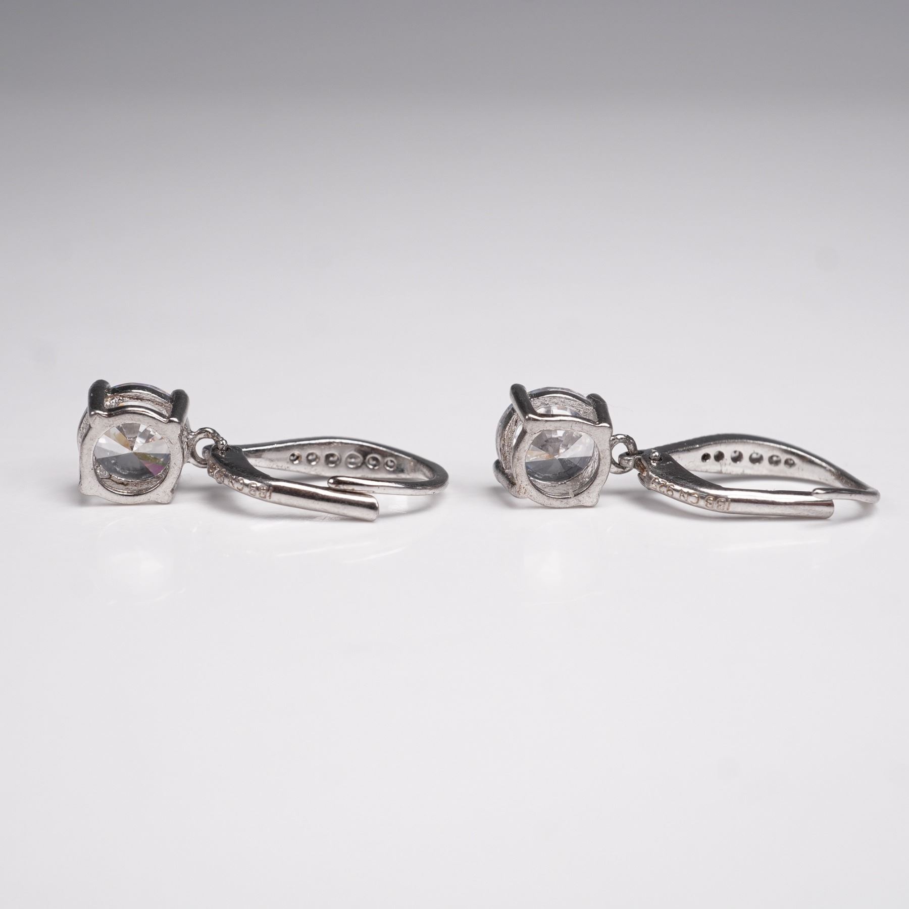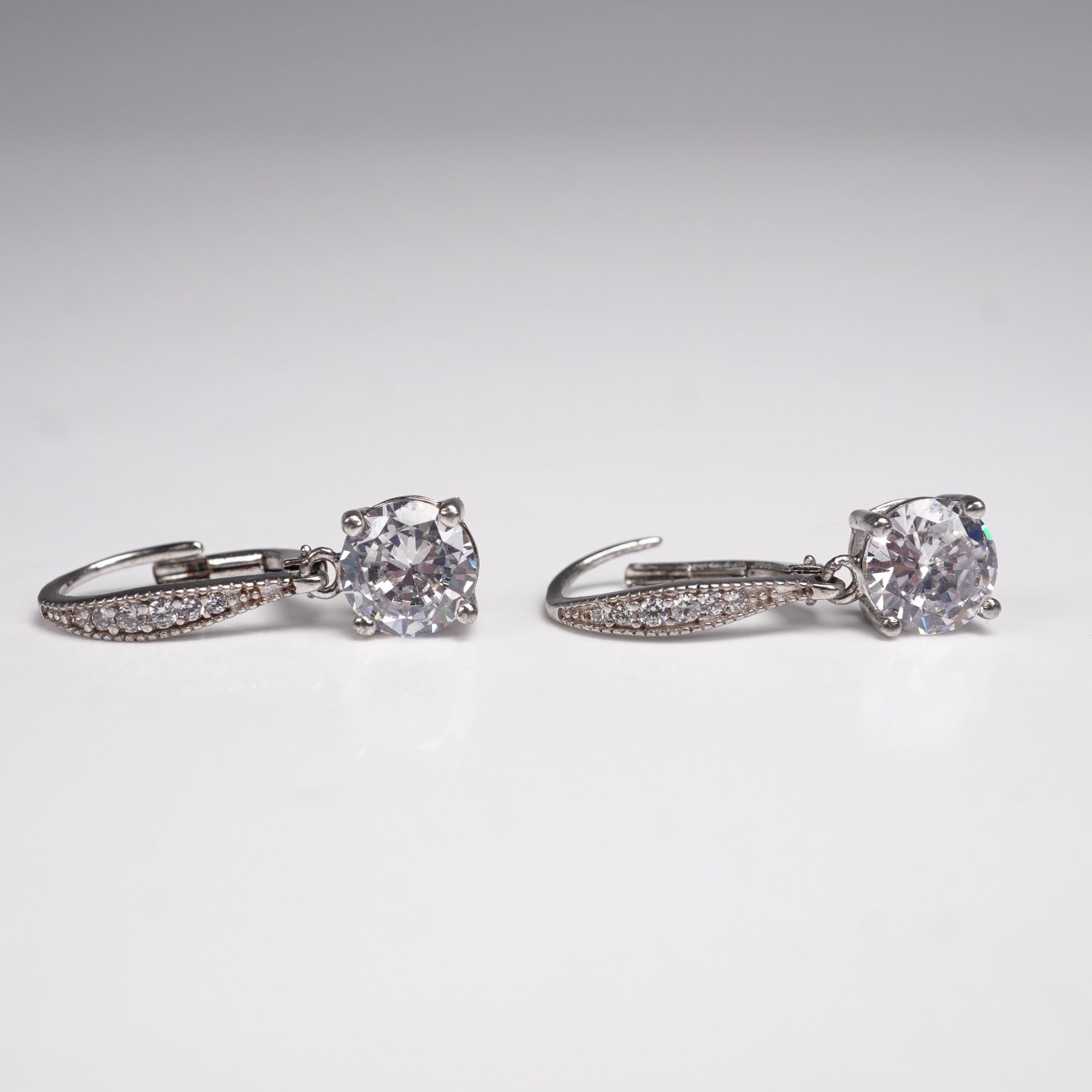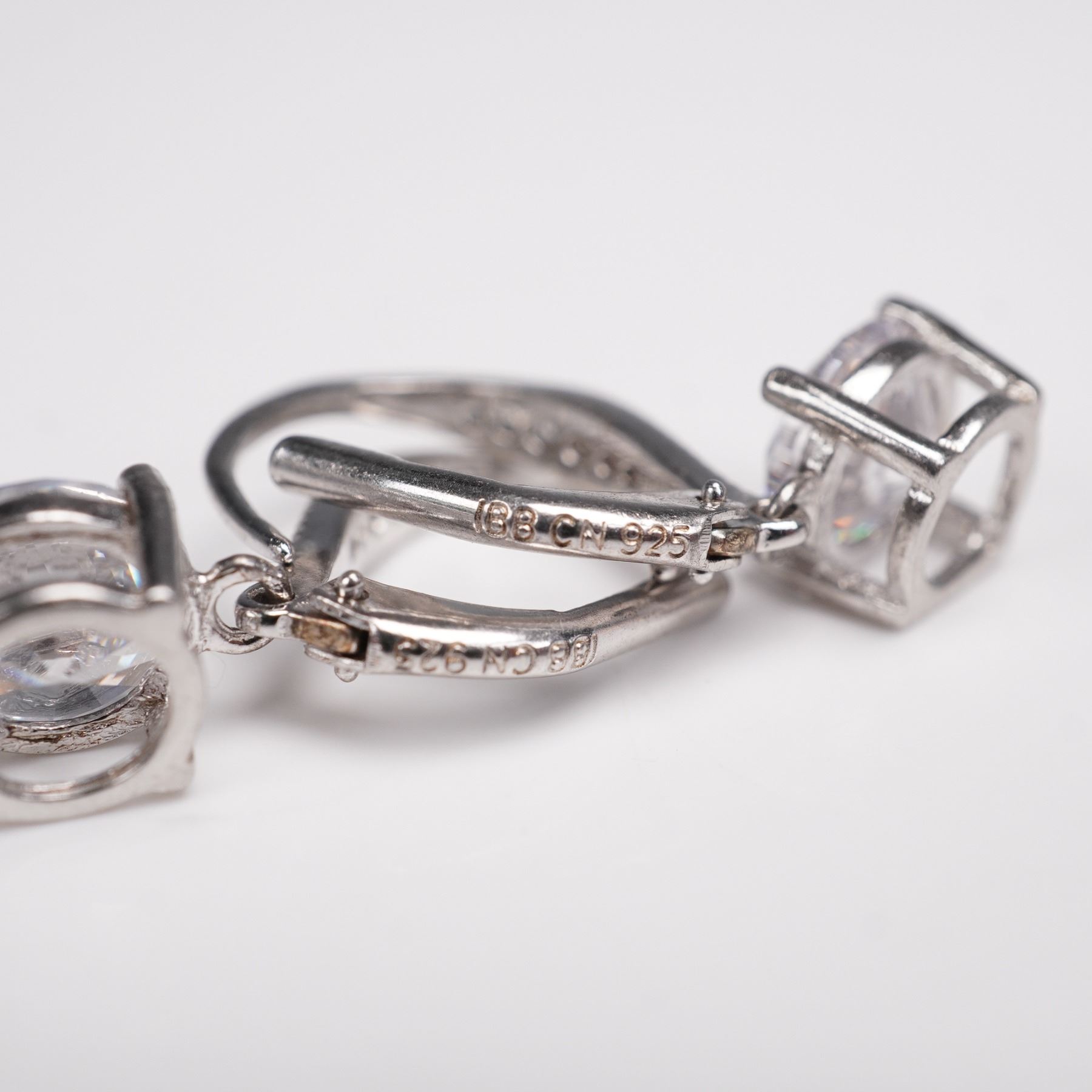 Elegant sterling silver drop earrings featuring large round faceted clear stones in prong settings, accented with smaller stones along the leverback closures. Marked 925 and IBB, a recognized international jewelry maker known for fine silver craftsmanship. Weight: 3g.