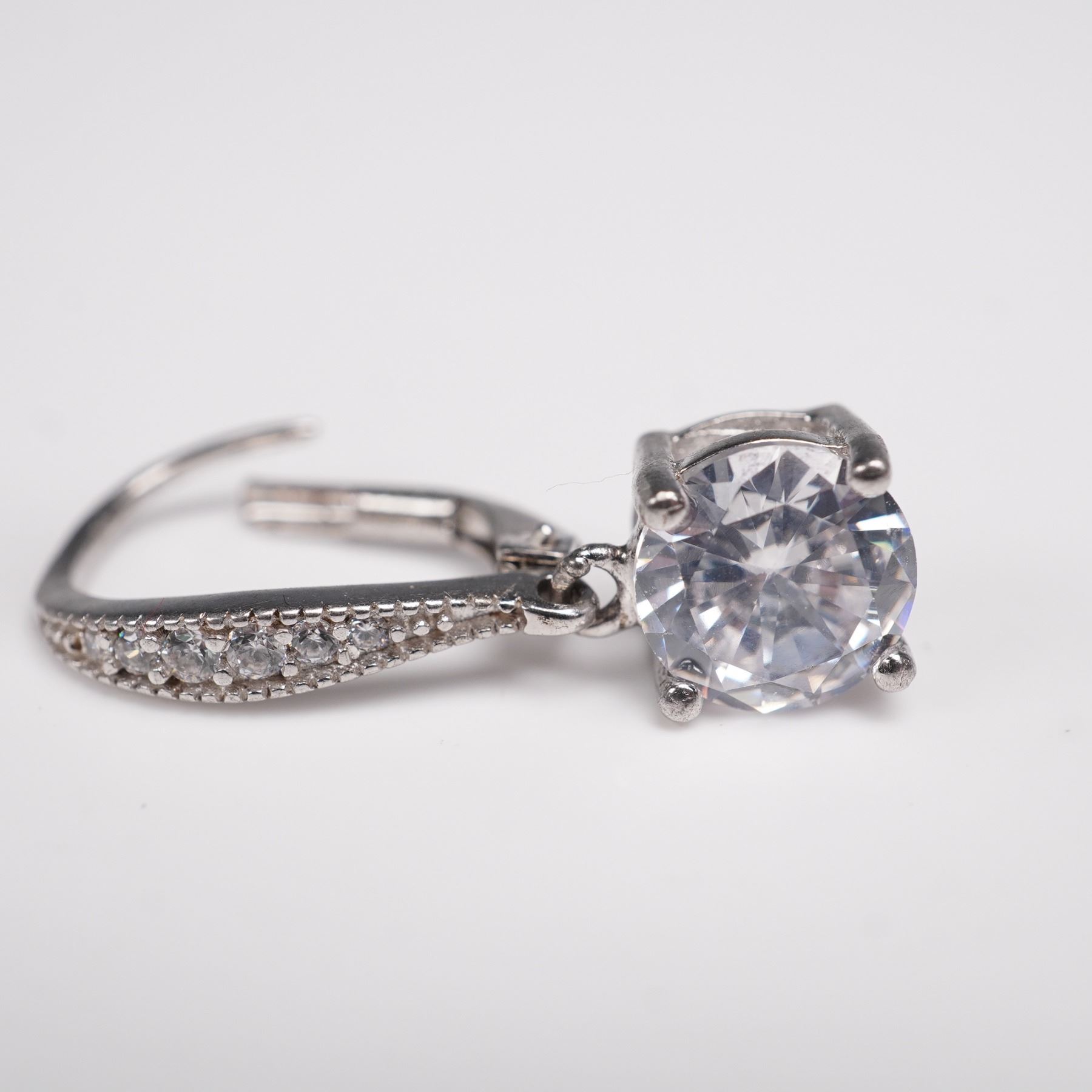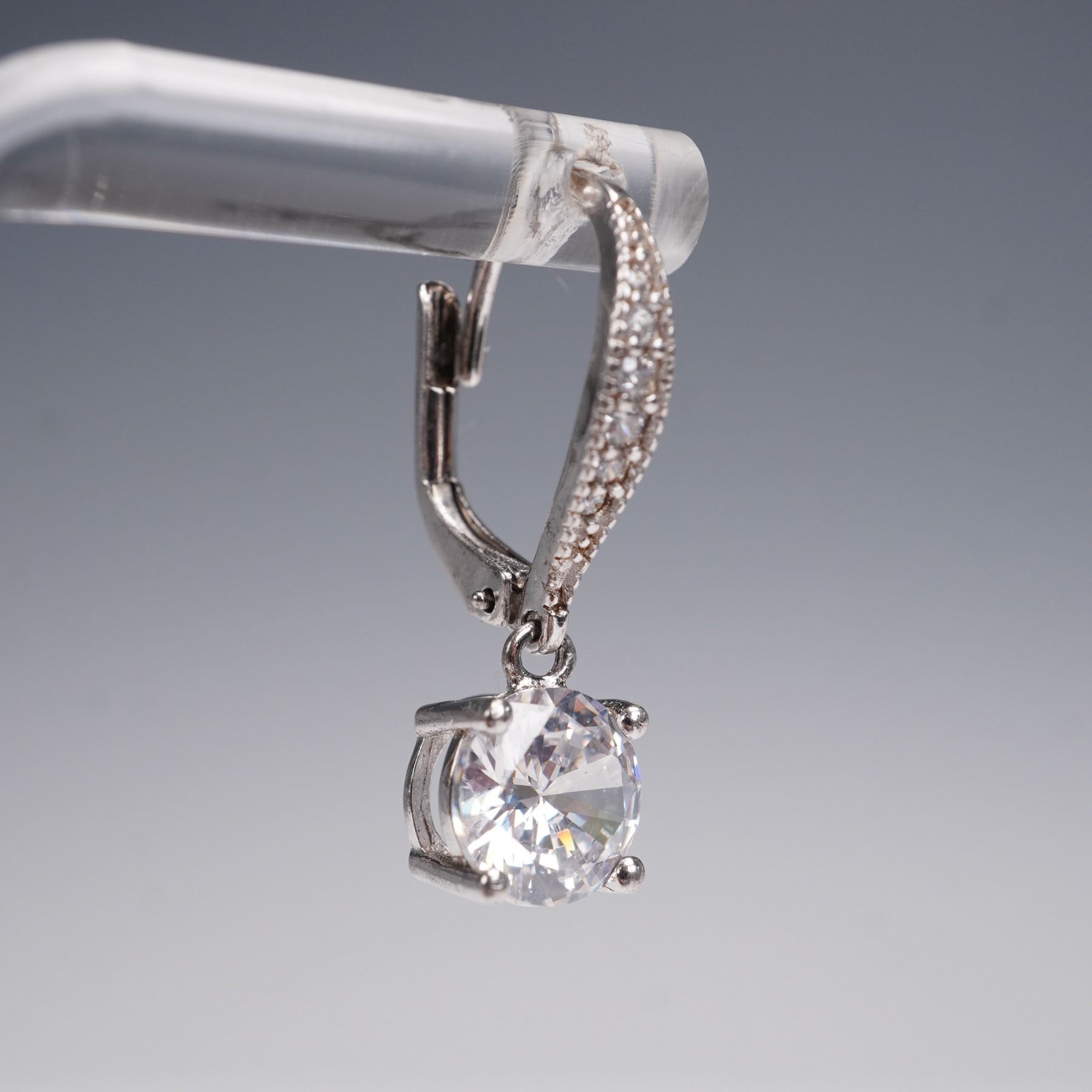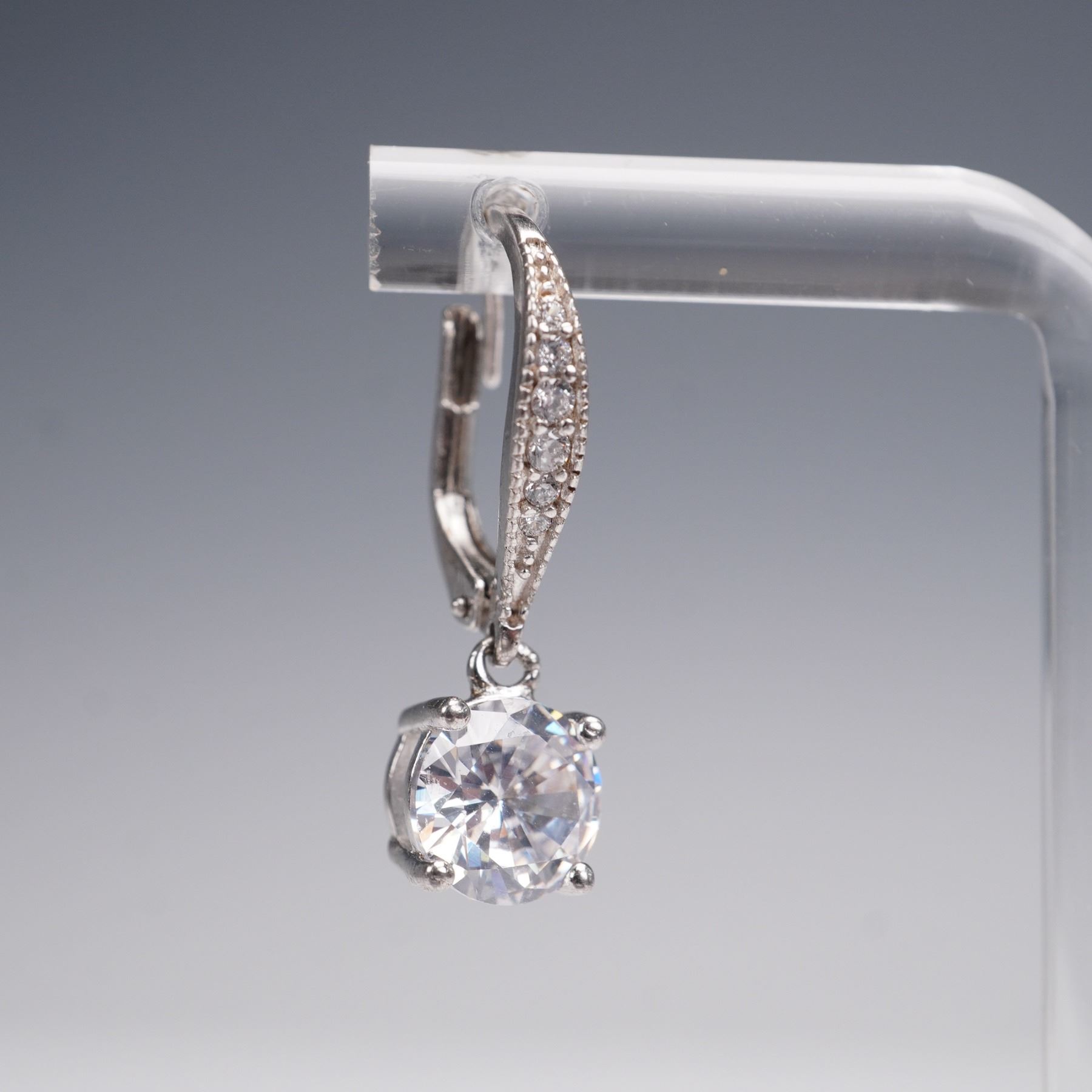 Elegant sterling silver drop earrings featuring large round faceted clear stones in prong settings, accented with smaller stones along the leverback closures. Marked 925 and IBB, a recognized international jewelry maker known for fine silver craftsmanship. Weight: 3g.