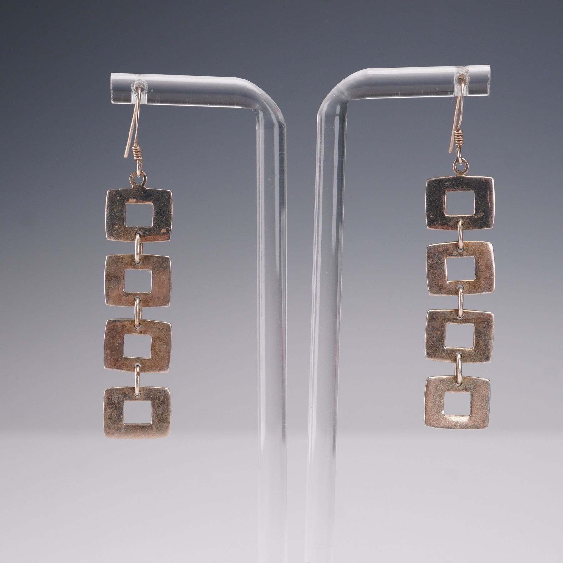 A striking pair of sterling silver drop earrings marked NF 925 Thailand, composed of four square-shaped open links joined in a vertical cascade. The bold geometric design gives these earrings a modernist flair, while the articulated links create natural movement when worn. Crafted in silver with a polished finish, these earrings bring a clean, sculptural element to any jewelry collection. Weight: 5.07g.