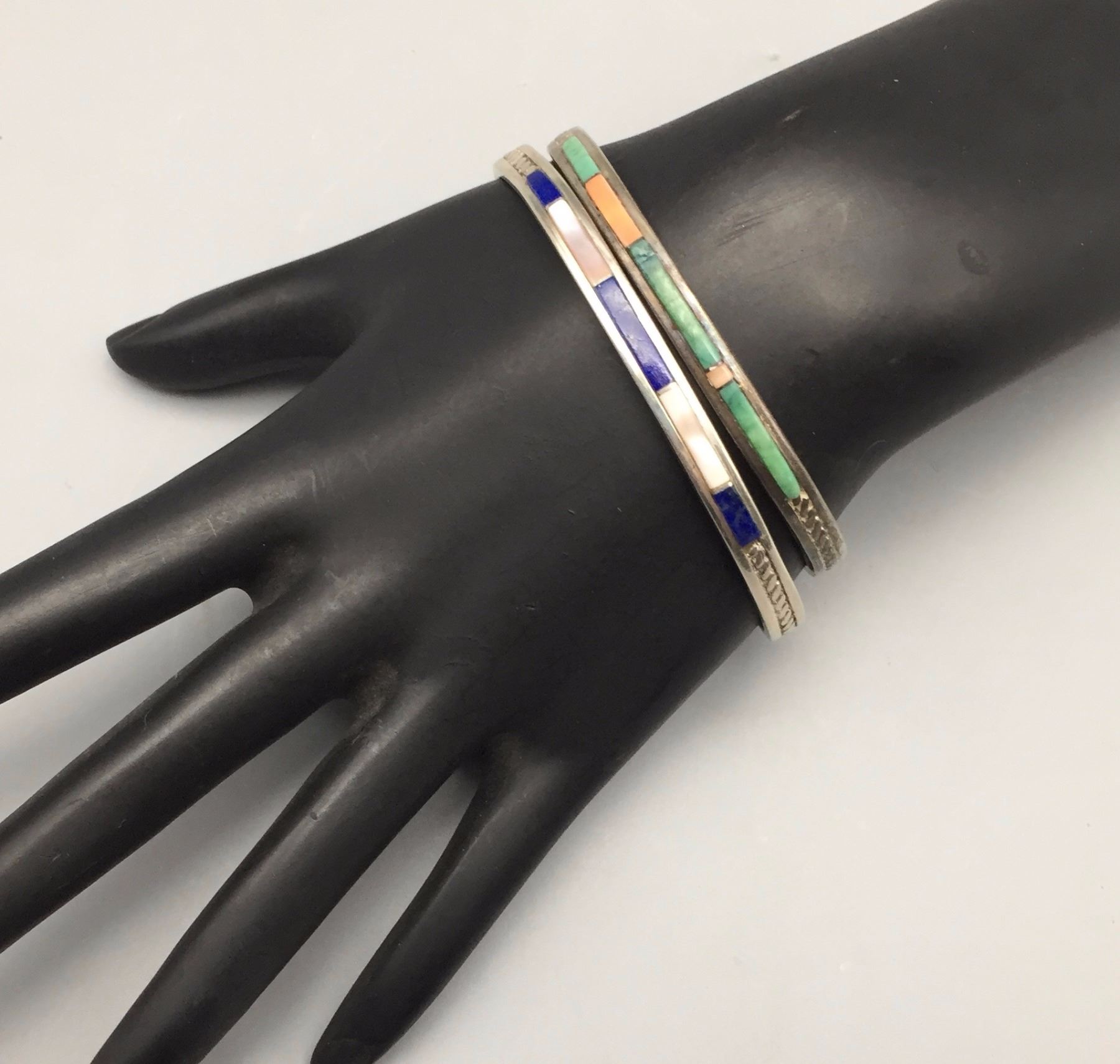 Maker: Unknown hallmark. Approx. Age: Fairly Modern. Size: 1) Inside circumference 5 1/4” with an additional 1 1/2” opening (fits 6 5/8” wrist). approx. 1/4” at it’s widest. 2) Inside circumference 5 3/8” with an additional 1” opening (fits 6 3/8” wrist). approx. 1/4” at it’s widest. Lot weighs 24.5 g. Additional Info: Pair of sterling silver multi-stone inlay bracelets. Condition: Good for their age, normal wear expected. New, old stock (NOS). Please look closely at the pictures - they are an important part of our description. Shipping: There will be a $5 handling / packaging fee for shipping this lot. The actual cost of postage will be added on top of that.